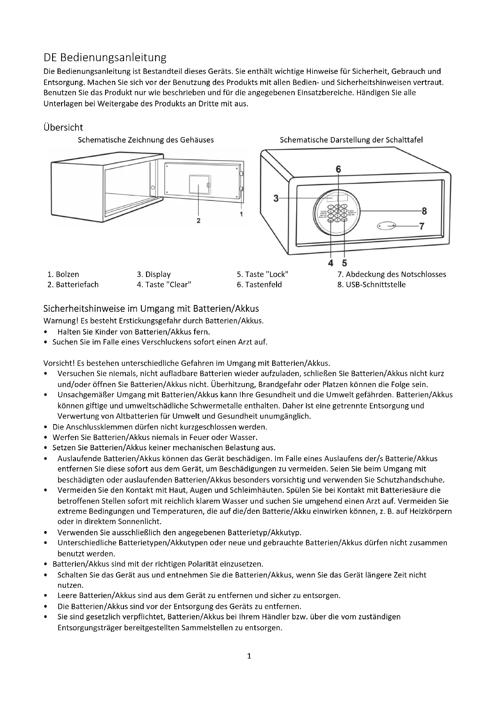 - Sie sind gesetzlich verpflichtet, Batterien/Akkus bei Ihrem Händler bzw. über die vom zuständigen Entsorgungsträger bereitgestellten Sammelstellen zu entsorgen.2 Verpackungsinhalt Prüfen Sie den Verpackungsinhalt des Tresors, bevor Sie den Tresor verwenden. Sollte etwas fehlen oder beschädigt sein, wenden Sie sich an unseren Service.