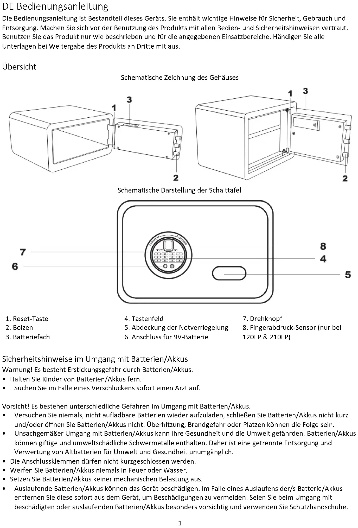120FP & 210FP) Sicherheitshinweise im Umgang mit Batterien/Akkus Warnung! Es besteht Erstickungsgefahr durch Batterien/Akkus.