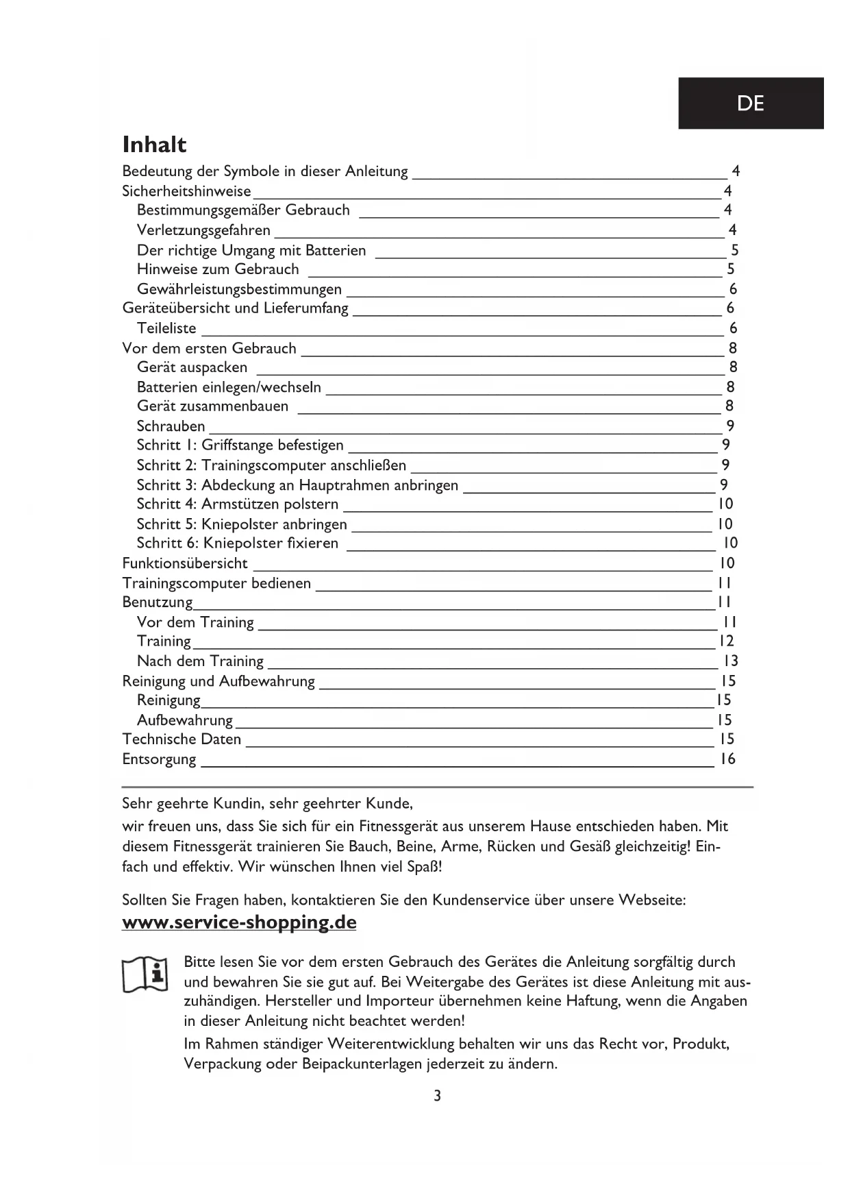 FR23 Sehr geehrte Kundin, sehr geehrter Kunde, wir freuen uns, dass Sie sich für ein Fitnessgerät aus unserem Hause entschieden haben. Mit diesem Fitnessgerät trainieren Sie Bauch, Beine, Arme, Rücken und Gesäß gleichzeitig! Ein- fach und effektiv. Wir wünschen Ihnen viel Spaß! Sollten Sie Fragen haben, kontaktieren Sie den Kundenservice über unsere Webseite: www.service-shopping.de Bitte lesen Sie vor dem ersten Gebrauch des Gerätes die Anleitung sorgfältig durch und bewahren Sie sie gut auf. Bei Weitergabe des Gerätes ist diese Anleitung mit aus- zuhändigen. Hersteller und Importeur übernehmen keine Haftung, wenn die Angaben in dieser Anleitung nicht beachtet werden! Im Rahmen ständiger Weiterentwicklung behalten wir uns das Recht vor, Produkt, Verpackung oder Beipackunterlagen jederzeit zu ändern.