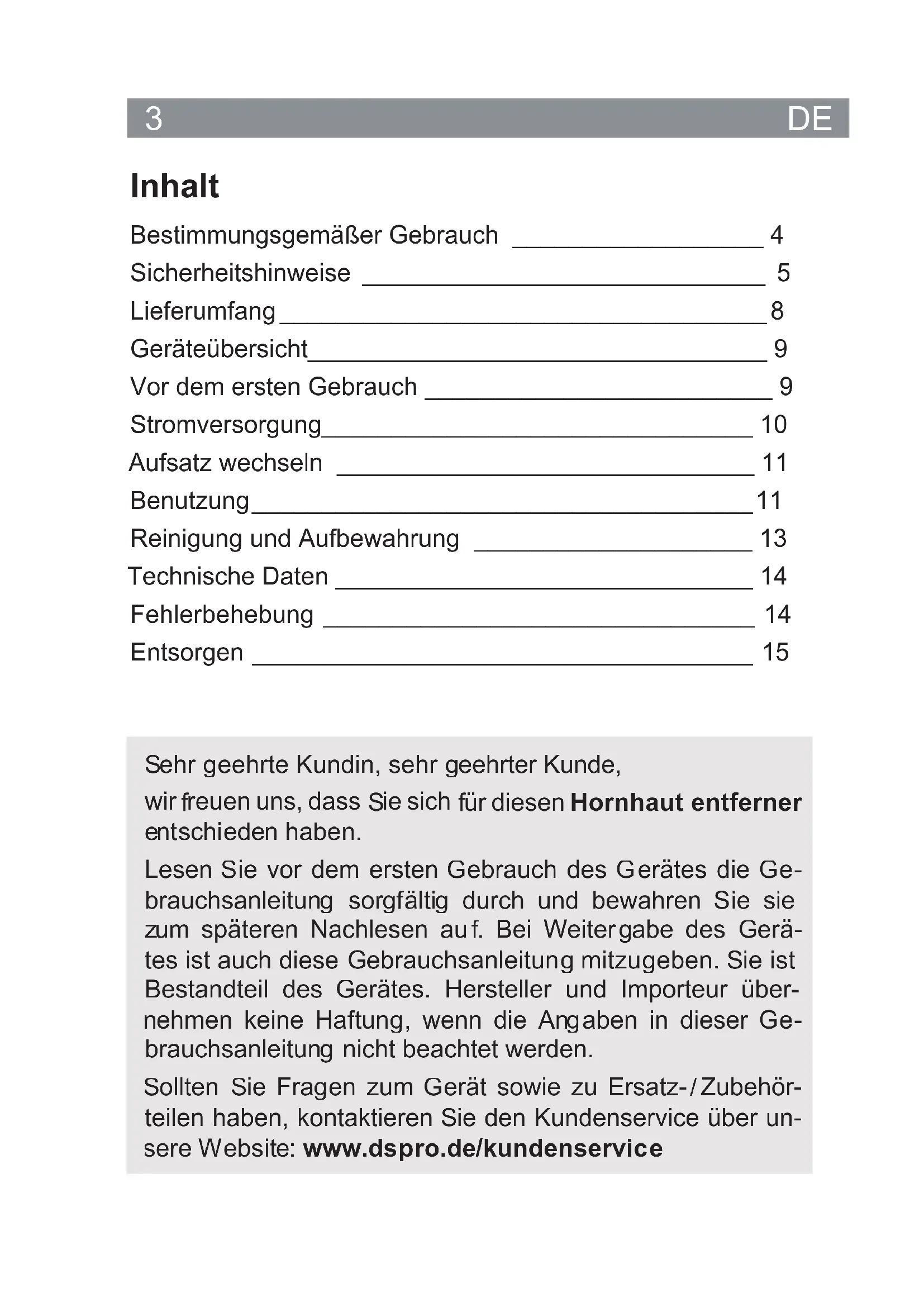 und Tiere unzugänglichen Ort aufbewahren.DE 14 Technische Daten Artikelnummer: 06200 Modell: BG-F-900 Spannungsversorgung: 6 V DC (4 x 1,5 V-Batterie, Typ AAA) ID Gebrauchsanleitung: Z 06200 M DS V1 0518 Fehlerbehebung Sollte das Gerät nicht ordnungsgemäß funktionieren, über- prüfen, ob ein Problem selbst behoben werden kann. Lässt sich mit den genannten Schritten das Problem nicht lösen, den Kundenservice kontaktieren. Nicht versuchen, ein elektrisches Gerät eigenständig zu reparieren! Problem mögliche Ursache / Lösung Das Gerät arbeitet nicht. Batteriebetrieb: Sind die Batterien zu schwach oder falsch eingelegt? Gegebenfalls neue Batterien einlegen bzw. Polarität prüfen. USB-Kabel: Sitzen die Steckverbin- dungen richtig? Sitz korrigieren. Ist die Steckdose defekt? Andere Steckdose ausprobieren. Ist der Netzadapter defekt oder unge- eignet? Anderen Netzadapter auspro- bieren. Ist keine Netzspannung vorhanden? Die Sicherung des elektrischen Vertei- lers (Sicherungskasten) überprüfen.15 DE Problem mögliche Ursache / Lösung Die Hornhaut wird nicht richtig entfernt. Der Aufsatz (8) ist abgenutzt. Den Aufsatz ersetzen. Das Gerät saugt nicht richtig. Ist der Filter verschmutzt? Den Filter reinigen. Gegebenenfalls muss der Filter ausgetauscht werden. Entsorgen Das Verpackungsmaterial umweltgerecht entsorgen und der Wertstoffsammlung zuführen. Die Batterien sind vor der Entsorgung des Gerätes zu entnehmen und getrennt vom Gerät an entsprechen- den Sammelstellen abzugeben. Dieses Gerät unterliegt der europäischen Richtli- nie 2012/19/EU für Elektro- und Elektronik-Altgeräte (WEEE). Dieses Gerät nicht als normalen Hausmüll, sondern umweltgerecht über einen behördlich zuge- lassenen Entsorgungsbetrieb entsorgen. Kundenservice / Importeur: DS Produkte GmbH Am Heisterbusch 1, 19258 Gallin, Deutschland Tel.: +49 38851 314650 (Anruf in das deutsche Festnetz zum Tarif Ihres Anbieters.) Alle Rechte vorbehalten.EN 16 Contents Intended Use _________________________________ 17 Safety Notices _________________________________ 18 Items Supplied ________________________________ 21 Device Overview _______________________________ 22 Before Initial Use _______________________________ 22 Power Supply _________________________________ 23 Changing the Attachment ________________________ 24 Use _________________________________________ 24 Cleaning and Storage ___________________________ 26 Technical Data _________________________________ 27 Troubleshooting ________________________________ 27 Disposal _____________________________________ 28 Dear