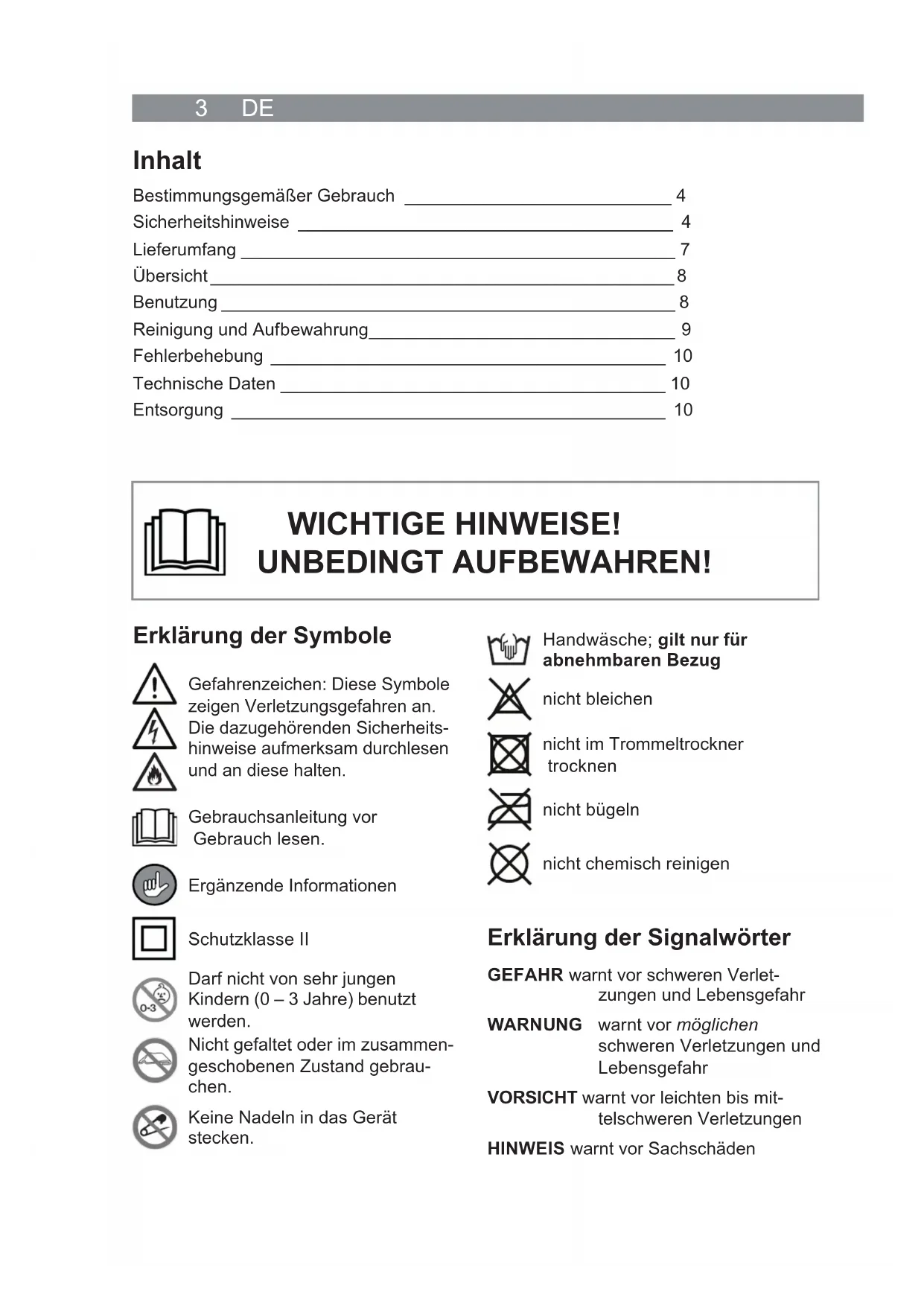 Gebruiksaanwijzing vanaf pagina 283 DE Inhalt Bestimmungsgemäßer Gebrauch ___________________________ 4 Sicherheitshinweise ______________________________________ 4 Lieferumfang ____________________________________________ 7 Übersicht _______________________________________________ 8 Benutzung ______________________________________________ 8 Reinigung und Auf b ewahrung _______________________________ 9 Fehlerbehebung ________________________________________ 10 Technische Daten _______________________________________ 10 Entsorgung ____________________________________________ 10 Erklärung der Symbole Gefahrenzeichen: Diese Symbole zeigen Verletzungsgefahren an. Die dazugehörenden Sicherheits- hinweise aufmerksam durchlesen und an diese halten. Gebrauchsanleitung vor Gebrauch lesen. Ergänzende Informationen Schutzklasse II Darf nicht von sehr jungen Kindern (0 – 3 Jahre) benutzt werden. Nicht gefaltet oder im zusammen- geschobenen Zustand gebrau- chen. Keine Nadeln in das Gerät stecken. Handwäsche; gilt nur für abnehmbaren Bezug nicht bleichen nicht im Trommeltrockner trocknen nicht bügeln nicht chemisch reinigen Erklärung der Signalwörter GEFAHR warnt vor schweren Verlet- zungen und Lebensgefahr WARNUNG warnt vor möglic hen schweren Verletzungen und Lebensgefahr VORSICHT warnt vor leichten bis mit- telschweren Verletzungen HINWEIS warnt vor Sachschäden WICHTIGE HINWEISE!