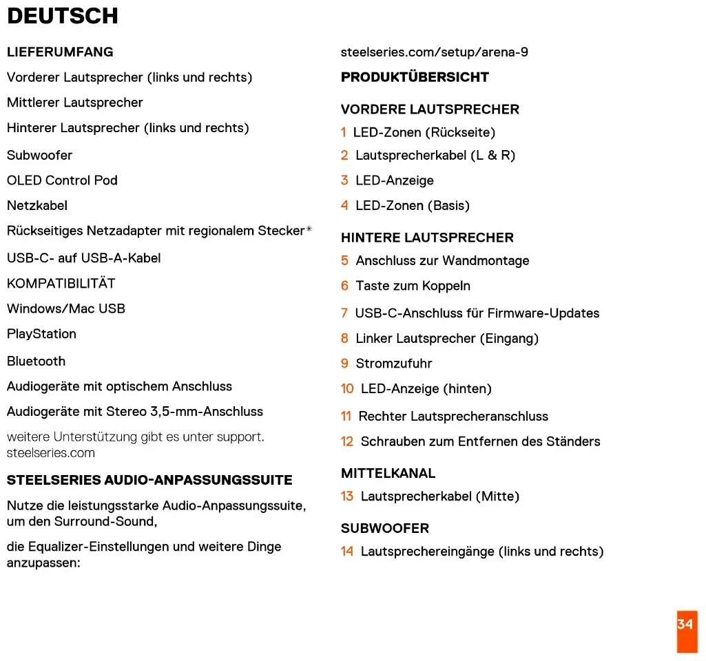 1 2 34 DEUTSCH LIEFERUMFANG Vorderer Lautsprecher (links und rechts) Mittlerer Lautsprecher Hinterer Lautsprecher (links und rechts) Subwoofer OLED Control Pod Netzkabel Rückseitiges Netzadapter mit regionalem Stecker* USB-C- auf USB-A-Kabel KOMPATIBILITÄT Windows/Mac USB PlayStation Bluetooth Audiogeräte mit optischem Anschluss Audiogeräte mit Stereo 3,5-mm-Anschluss weitere Unterstützung gibt es unter support. steelseries.com STEELSERIES AUDIO-ANPASSUNGSSUITE Nutze die leistungsstarke Audio-Anpassungssuite, um den Surround-Sound, die Equalizer-Einstellungen und weitere Dinge anzupassen: steelseries.com/setup/arena-9 PRODUKTÜBERSICHT VORDERE LAUTSPRECHER 1 LED-Zonen (Rückseite) 2 Lautsprecherkabel (L & R) 3 LED-Anzeige 4 LED-Zonen (Basis) HINTERE LAUTSPRECHER 5 Anschluss zur Wandmontage 6 Taste zum Koppeln 7 USB-C-Anschluss für Firmware-Updates 8 Linker Lautsprecher (Eingang) 9 Stromzufuhr 10 LED-Anzeige (hinten) 11 Rechter Lautsprecheranschluss 12 Schrauben zum Entfernen des Ständers MITTELKANAL 13 Lautsprecherkabel (Mitte) SUBWOOFER 14 Lautsprechereingänge (links und rechts)35 15 USB-C-PC-Anschluss 16 Ein- und Ausschalter 17 Subwoofer-Lautstärkeregler 18 OLED Control Pod-Anschluss 19 Optischer Audioeingang 20 Optische Audiobuchse 21 Lautsprechereingang (Mitte) 22 Aux-Eingang 23 Netzkabelanschluss