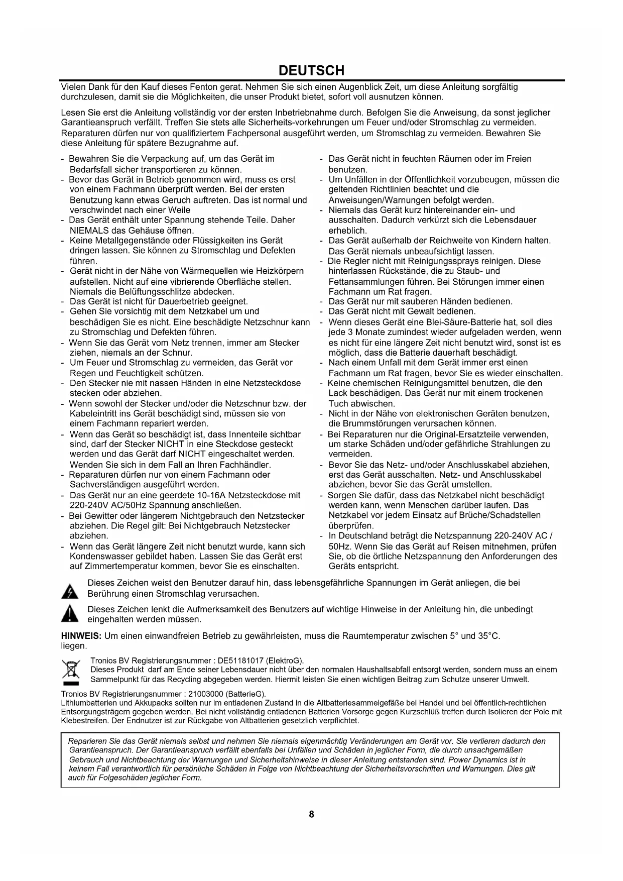 Indien er om een wachtwoord wordt gevraagd, voer "0000" in. Opmerking: De BT heeft een bereik van ongeveer 10 meter zonder enkele barrière.8 DEUTSCH Vielen Dank für den Kauf dieses Fenton gerat. Nehmen Sie sich einen Augenblick Zeit, um diese Anleitung sorgfältig durchzulesen, damit sie die Möglichkeiten, die unser Produkt bietet, sofort voll ausnutzen können. Lesen Sie erst die Anleitung vollständig vor der ersten Inbetriebnahme durch. Befolgen Sie die Anweisung, da sonst jeglicher Garantieanspruch verfällt. Treffen Sie stets alle Sicherheits-vorkehrungen um Feuer und/oder Stromschlag zu vermeiden. Reparaturen dürfen nur von qualifiziertem Fachpersonal ausgeführt werden, um Stromschlag zu vermeiden. Bewahren Sie diese Anleitung für spätere Bezugnahme auf. - Bewahren Sie die Verpackung auf, um das Gerät im Bedarfsfall sicher transportieren zu können. - Bevor das Gerät in Betrieb genommen wird, muss es erst von einem Fachmann überprüft werden. Bei der ersten Benutzung kann etwas Geruch auftreten. Das ist normal und verschwindet nach einer Weile - Das Gerät enthält unter Spannung stehende Teile. Daher NIEMALS das Gehäuse öffnen. - Keine Metallgegenstände oder Flüssigkeiten ins Gerät dringen lassen. Sie können zu Stromschlag und Defekten führen. - Gerät nicht in der Nähe von Wärmequellen wie Heizkörpern aufstellen. Nicht auf eine vibrierende Oberfläche stellen. Niemals die Belüftungsschlitze abdecken. - Das Gerät ist nicht für Dauerbetrieb geeignet. - Gehen Sie vorsichtig mit dem Netzkabel um und beschädigen Sie es nicht. Eine beschädigte Netzschnur kann zu Stromschlag und Defekten führen. - Wenn Sie das Gerät vom Netz trennen, immer am Stecker ziehen, niemals an der Schnur. - Um Feuer und Stromschlag zu vermeiden, das Gerät vor Regen und Feuchtigkeit schützen. - Den Stecker nie mit nassen Händen in eine Netzsteckdose stecken oder abziehen. - Wenn sowohl der Stecker und/oder die Netzschnur bzw. der Kabeleintritt ins Gerät beschädigt sind, müssen sie von einem Fachmann repariert werden. - Wenn das Gerät so beschädigt ist, dass Innenteile sichtbar sind, darf der Stecker NICHT in eine Steckdose gesteckt werden und das Gerät darf NICHT eingeschaltet werden. Wenden Sie sich in dem Fall an Ihren Fachhändler. - Reparaturen dürfen nur von einem Fachmann oder Sachverständigen ausgeführt werden. - Das Gerät nur an eine geerdete 10-16A Netzsteckdose mit 220-240V AC/50Hz Spannung anschließen. - Bei Gewitter oder längerem Nichtgebrauch den Netzstecker abziehen. Die Regel gilt: Bei Nichtgebrauch Netzstecker abziehen. - Wenn das Gerät längere Zeit nicht benutzt wurde, kann sich Kondenswasser gebildet haben. Lassen Sie das Gerät erst auf Zimmertemperatur kommen, bevor Sie es einschalten. - Das Gerät nicht in feuchten Räumen oder im Freien benutzen. - Um Unfällen in der Öffentlichkeit vorzubeugen, müssen die geltenden Richtlinien beachtet und die Anweisungen/Warnungen befolgt werden. - Niemals das Gerät kurz hintereinander ein- und ausschalten. Dadurch verkürzt sich die Lebensdauer erheblich. - Das Gerät außerhalb der Reichweite von Kindern halten. Das Gerät niemals unbeaufsichtigt lassen. - Die Regler nicht mit Reinigungssprays reinigen. Diese hinterlassen Rückstände, die zu Staub- und Fettansammlungen führen. Bei Störungen immer einen Fachmann um Rat fragen. - Das Gerät nur mit sauberen Händen bedienen. - Das Gerät nicht mit Gewalt bedienen. - Wenn dieses Gerät eine Blei-Säure-Batterie hat, soll dies jede 3 Monate zumindest wieder aufgeladen werden, wenn es nicht für eine längere Zeit nicht benutzt wird, sonst ist es möglich, dass die Batterie dauerhaft beschädigt. - Nach einem Unfall mit dem Gerät immer erst einen Fachmann um Rat fragen, bevor Sie es wieder einschalten. - Keine chemischen Reinigungsmittel benutzen, die den Lack beschädigen. Das Gerät nur mit einem trockenen Tuch abwischen. - Nicht in der Nähe von elektronischen Geräten benutzen, die Brummstörungen verursachen können. - Bei Reparaturen nur die Original-Ersatzteile verwenden, um starke Schäden und/oder gefährliche Strahlungen zu vermeiden. - Bevor Sie das Netz- und/oder Anschlusskabel abziehen, erst das Gerät ausschalten. Netz- und Anschlusskabel abziehen, bevor Sie das Gerät umstellen. - Sorgen Sie dafür, dass das Netzkabel nicht beschädigt werden kann, wenn Menschen darüber laufen. Das Netzkabel vor jedem Einsatz auf Brüche/Schadstellen überprüfen. - In Deutschland beträgt die Netzspannung 220-240V AC / 50Hz. Wenn Sie das Gerät auf Reisen mitnehmen, prüfen Sie, ob die örtliche Netzspannung den Anforderungen des Geräts entspricht. Dieses Zeichen weist den Benutzer darauf hin, dass lebensgefährliche Spannungen im Gerät anliegen, die bei Berührung einen Stromschlag verursachen. Dieses Zeichen lenkt die Aufmerksamkeit des Benutzers auf wichtige Hinweise in der Anleitung hin, die unbedingt eingehalten werden müssen. HINWEIS: Um einen einwandfreien Betrieb zu gewährleisten, muss die Raumtemperatur zwischen 5° und 35°C. liegen. Tronios BV Registrierungsnummer : DE51181017 (ElektroG). Dieses Produkt darf am Ende seiner Lebensdauer nicht über den normalen Haushaltsabfall entsorgt werden, sondern muss an einem Sammelpunkt für das Recycling abgegeben werden. Hiermit leisten Sie einen wichtigen Beitrag zum Schutze unserer Umwelt. Tronios BV Registrierungsnummer : 21003000 (BatterieG). Lithiumbatterien und Akkupacks sollten nur im entladenen Zustand in die Altbatteriesammelgefäße bei Handel und bei öffentlich-rechtlichen Entsorgungsträgern gegeben werden. Bei nicht vollständig entladenen Batterien Vorsorge gegen Kurzschlüß treffen durch Isolieren der Pole mit Klebestreifen. Der Endnutzer ist zur Rückgabe von Altbatterien gesetzlich verpflichtet.