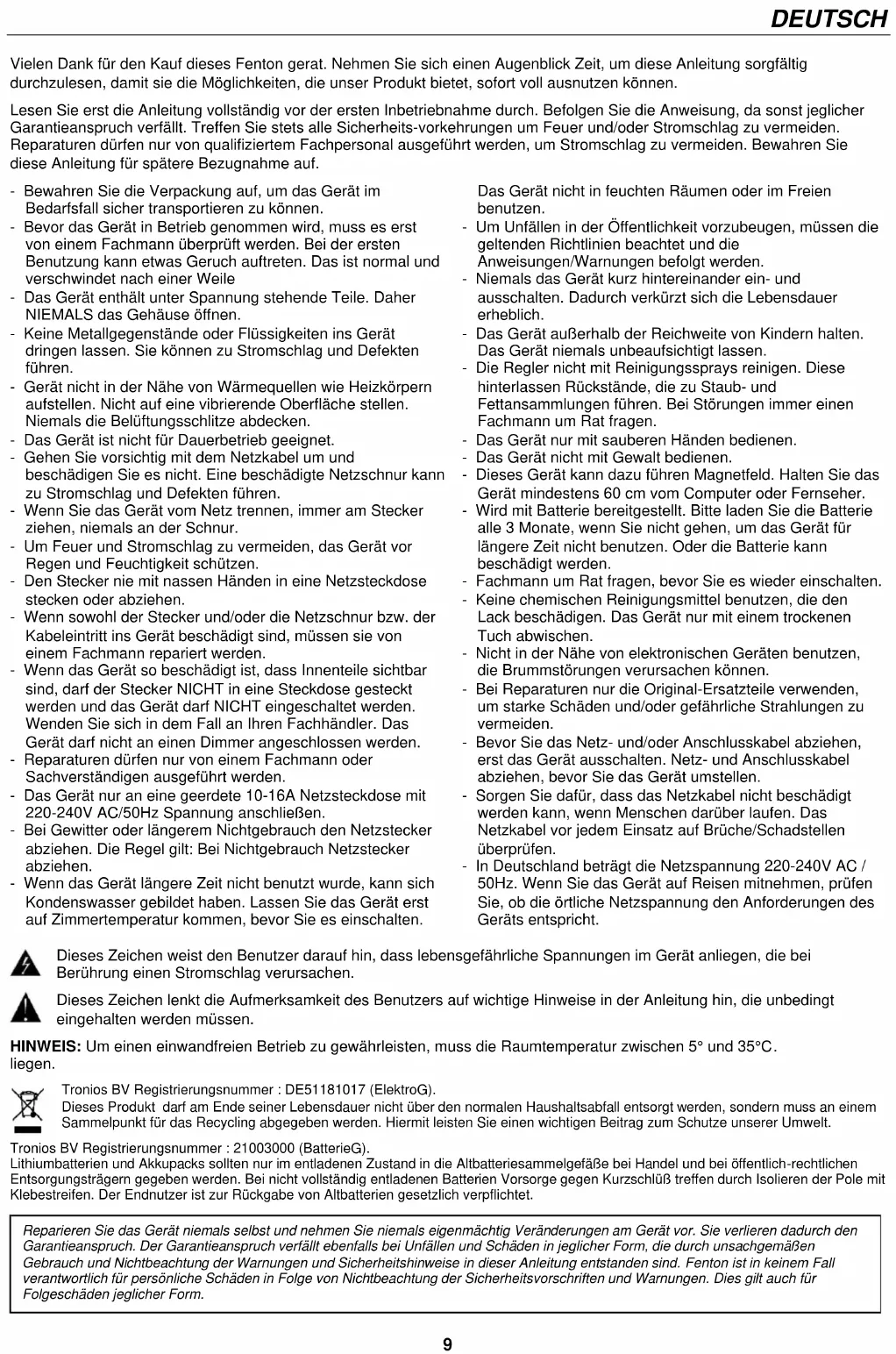 probeer dan uw systeeminstellingen te controleren of de audio-ingangsinstellingen via het geluidspaneel aan te passen. Opmerking: De meegeleverde Audacity software dient slechts ter referentie. Voor meer infromatie en actuele updates zie http://www.audacity.com .9 DEUTSCH Vielen Dank für den Kauf dieses Fenton gerat. Nehmen Sie sich einen Augenblick Zeit, um diese Anleitung sorgfältig durchzulesen, damit sie die Möglichkeiten, die unser Produkt bietet, sofort voll ausnutzen können. Lesen Sie erst die Anleitung vollständig vor der ersten Inbetriebnahme durch. Befolgen Sie die Anweisung, da sonst jeglicher Garantieanspruch verfällt. Treffen Sie stets alle Sicherheits-vorkehrungen um Feuer und/oder Stromschlag zu vermeiden. Reparaturen dürfen nur von qualifiziertem Fachpersonal ausgeführt werden, um Stromschlag zu vermeiden. Bewahren Sie diese Anleitung für spätere Bezugnahme auf. - Bewahren Sie die Verpackung auf, um das Gerät im Bedarfsfall sicher transportieren zu können. - Bevor das Gerät in Betrieb genommen wird, muss es erst von einem Fachmann überprüft werden. Bei der ersten Benutzung kann etwas Geruch auftreten. Das ist normal und verschwindet nach einer Weile - Das Gerät enthält unter Spannung stehende Teile. Daher NIEMALS das Gehäuse öffnen. - Keine Metallgegenstände oder Flüssigkeiten ins Gerät dringen lassen. Sie können zu Stromschlag und Defekten führen. - Gerät nicht in der Nähe von Wärmequellen wie Heizkörpern aufstellen. Nicht auf eine vibrierende Oberfläche stellen. Niemals die Belüftungsschlitze abdecken. - Das Gerät ist nicht für Dauerbetrieb geeignet. - Gehen Sie vorsichtig mit dem Netzkabel um und beschädigen Sie es nicht. Eine beschädigte Netzschnur kann zu Stromschlag und Defekten führen. - Wenn Sie das Gerät vom Netz trennen, immer am Stecker ziehen, niemals an der Schnur. - Um Feuer und Stromschlag zu vermeiden, das Gerät vor Regen und Feuchtigkeit schützen. - Den Stecker nie mit nassen Händen in eine Netzsteckdose stecken oder abziehen. - Wenn sowohl der Stecker und/oder die Netzschnur bzw. der Kabeleintritt ins Gerät beschädigt sind, müssen sie von einem Fachmann repariert werden. - Wenn das Gerät so beschädigt ist, dass Innenteile sichtbar sind, darf der Stecker NICHT in eine Steckdose gesteckt werden und das Gerät darf NICHT eingeschaltet werden. Wenden Sie sich in dem Fall an Ihren Fachhändler. Das Gerät darf nicht an einen Dimmer angeschlossen werden. - Reparaturen dürfen nur von einem Fachmann oder Sachverständigen ausgeführt werden. - Das Gerät nur an eine geerdete 10-16A Netzsteckdose mit 220-240V AC/50Hz Spannung anschließen. - Bei Gewitter oder längerem Nichtgebrauch den Netzstecker abziehen. Die Regel gilt: Bei Nichtgebrauch Netzstecker abziehen. - Wenn das Gerät längere Zeit nicht benutzt wurde, kann sich Kondenswasser gebildet haben. Lassen Sie das Gerät erst auf Zimmertemperatur kommen, bevor Sie es einschalten. Das Gerät nicht in feuchten Räumen oder im Freien benutzen. - Um Unfällen in der Öffentlichkeit vorzubeugen, müssen die geltenden Richtlinien beachtet und die Anweisungen/Warnungen befolgt werden. - Niemals das Gerät kurz hintereinander ein- und ausschalten. Dadurch verkürzt sich die Lebensdauer erheblich. - Das Gerät außerhalb der Reichweite von Kindern halten. Das Gerät niemals unbeaufsichtigt lassen. - Die Regler nicht mit Reinigungssprays reinigen. Diese hinterlassen Rückstände, die zu Staub- und Fettansammlungen führen. Bei Störungen immer einen Fachmann um Rat fragen. - Das Gerät nur mit sauberen Händen bedienen. - Das Gerät nicht mit Gewalt bedienen. - Dieses Gerät kann dazu führen Magnetfeld. Halten Sie das Gerät mindestens 60 cm vom Computer oder Fernseher. - Wird mit Batterie bereitgestellt. Bitte laden Sie die Batterie alle 3 Monate, wenn Sie nicht gehen, um das Gerät für längere Zeit nicht benutzen. Oder die Batterie kann beschädigt werden. - Fachmann um Rat fragen, bevor Sie es wieder einschalten. - Keine chemischen Reinigungsmittel benutzen, die den Lack beschädigen. Das Gerät nur mit einem trockenen Tuch abwischen. - Nicht in der Nähe von elektronischen Geräten benutzen, die Brummstörungen verursachen können. - Bei Reparaturen nur die Original-Ersatzteile verwenden, um starke Schäden und/oder gefährliche Strahlungen zu vermeiden. - Bevor Sie das Netz- und/oder Anschlusskabel abziehen, erst das Gerät ausschalten. Netz- und Anschlusskabel abziehen, bevor Sie das Gerät umstellen. - Sorgen Sie dafür, dass das Netzkabel nicht beschädigt werden kann, wenn Menschen darüber laufen. Das Netzkabel vor jedem Einsatz auf Brüche/Schadstellen überprüfen. - In Deutschland beträgt die Netzspannung 220-240V AC / 50Hz. Wenn Sie das Gerät auf Reisen mitnehmen, prüfen Sie, ob die örtliche Netzspannung den Anforderungen des Geräts entspricht. Dieses Zeichen weist den Benutzer darauf hin, dass lebensgefährliche Spannungen im Gerät anliegen, die bei Berührung einen Stromschlag verursachen. Dieses Zeichen lenkt die Aufmerksamkeit des Benutzers auf wichtige Hinweise in der Anleitung hin, die unbedingt eingehalten werden müssen. HINWEIS: Um einen einwandfreien Betrieb zu gewährleisten, muss die Raumtemperatur zwischen 5° und 35°C. liegen. Tronios BV Registrierungsnummer : DE51181017 (ElektroG). Dieses Produkt darf am Ende seiner Lebensdauer nicht über den normalen Haushaltsabfall entsorgt werden, sondern muss an einem Sammelpunkt für das Recycling abgegeben werden. Hiermit leisten Sie einen wichtigen Beitrag zum Schutze unserer Umwelt. Tronios BV Registrierungsnummer : 21003000 (BatterieG). Lithiumbatterien und Akkupacks sollten nur im entladenen Zustand in die Altbatteriesammelgefäße bei Handel und bei öffentlich-rechtlichen Entsorgungsträgern gegeben werden. Bei nicht vollständig entladenen Batterien Vorsorge gegen Kurzschlüß treffen durch Isolieren der Pole mit Klebestreifen. Der Endnutzer ist zur Rückgabe von Altbatterien gesetzlich v