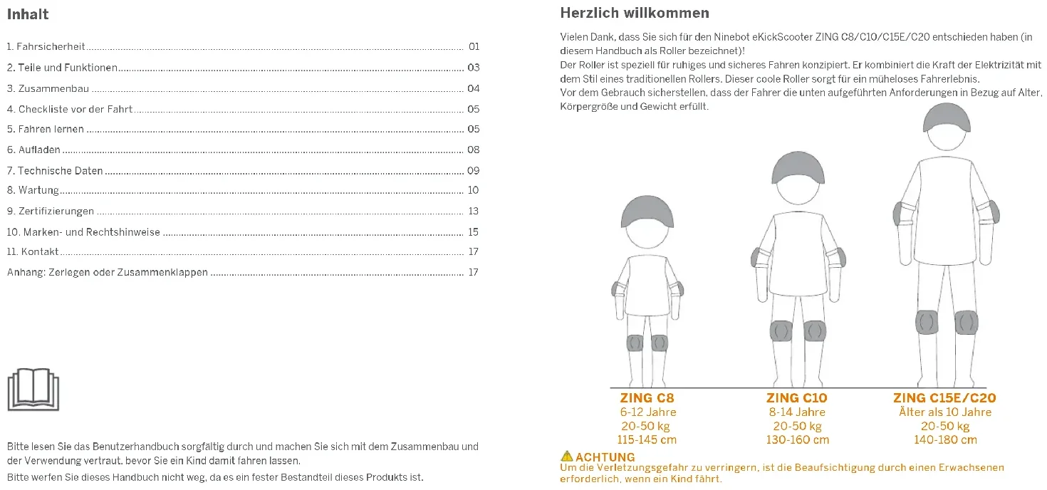 BenutzerhandbuchACHTUNG Um die Verletzungsgefahr zu verringern, ist die Beaufsichtigung durch einen Erwachsenen erforderlich, wenn ein Kind fährt. Vielen Dank, dass Sie sich für den Ninebot eKickScooter ZING C8/C10/C15E/C20 entschieden haben (in diesem Handbuch als Roller bezeichnet)! Der Roller ist speziell für ruhiges und sicheres Fahren konzipiert. Er kombiniert die Kraft der Elektrizität mit dem Stil eines traditionellen Rollers. Dieser coole Roller sorgt für ein müheloses Fahrerlebnis. Vor dem Gebrauch sicherstellen, dass der Fahrer die unten aufgeführten Anforderungen in Bezug auf Alter, Körpergröße und Gewicht erfüllt. Bitte lesen Sie das Benutzerhandbuch sorgfältig durch und machen Sie sich mit dem Zusammenbau und der Verwendung vertraut, bevor Sie ein Kind damit fahren lassen. Bitte werfen Sie dieses Handbuch nicht weg, da es ein fester Bestandteil dieses Produkts ist. Inhalt ZING C8 6-12 Jahre 20-50 kg 115-145 cm ZING C10 8-14 Jahre 20-50 kg 130-160 cm