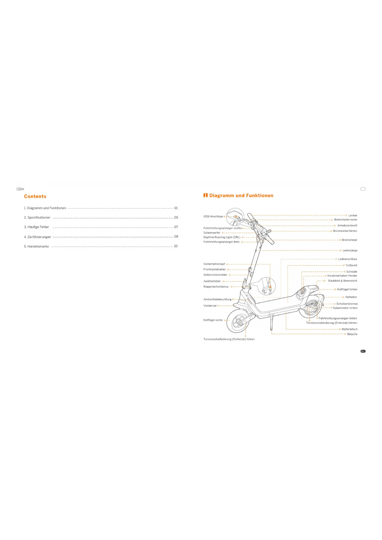 10Lenker Lenkstange Kotflügel hinten Nabenmotor hinten Batteriefach Béquille Bremshebel Fahrtrichtungsanzeiger links Armaturenbrett Scheinwerfer Fahrtrichtungsanzeiger rechts Frontrückstrahler Kotflügel vorne Vorderrad Scheibenbremse Auslösehebel Klappmechanismus Sicherheitsknopf Daytime Running Light (DRL) Seitenrückstrahler Trittbrett Ladeanschluss