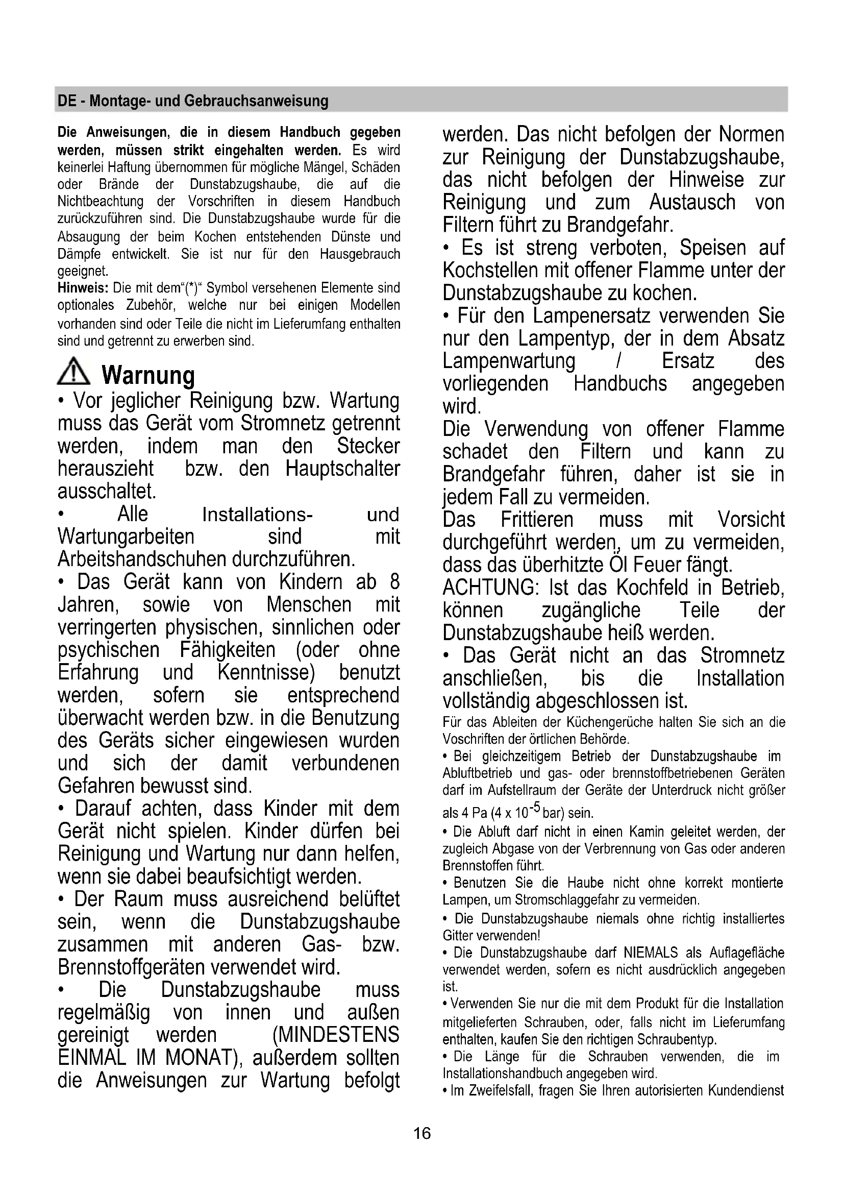 - Es ist streng verboten, Speisen auf Kochstellen mit offener Flamme unter der Dunstabzugshaube zu kochen.