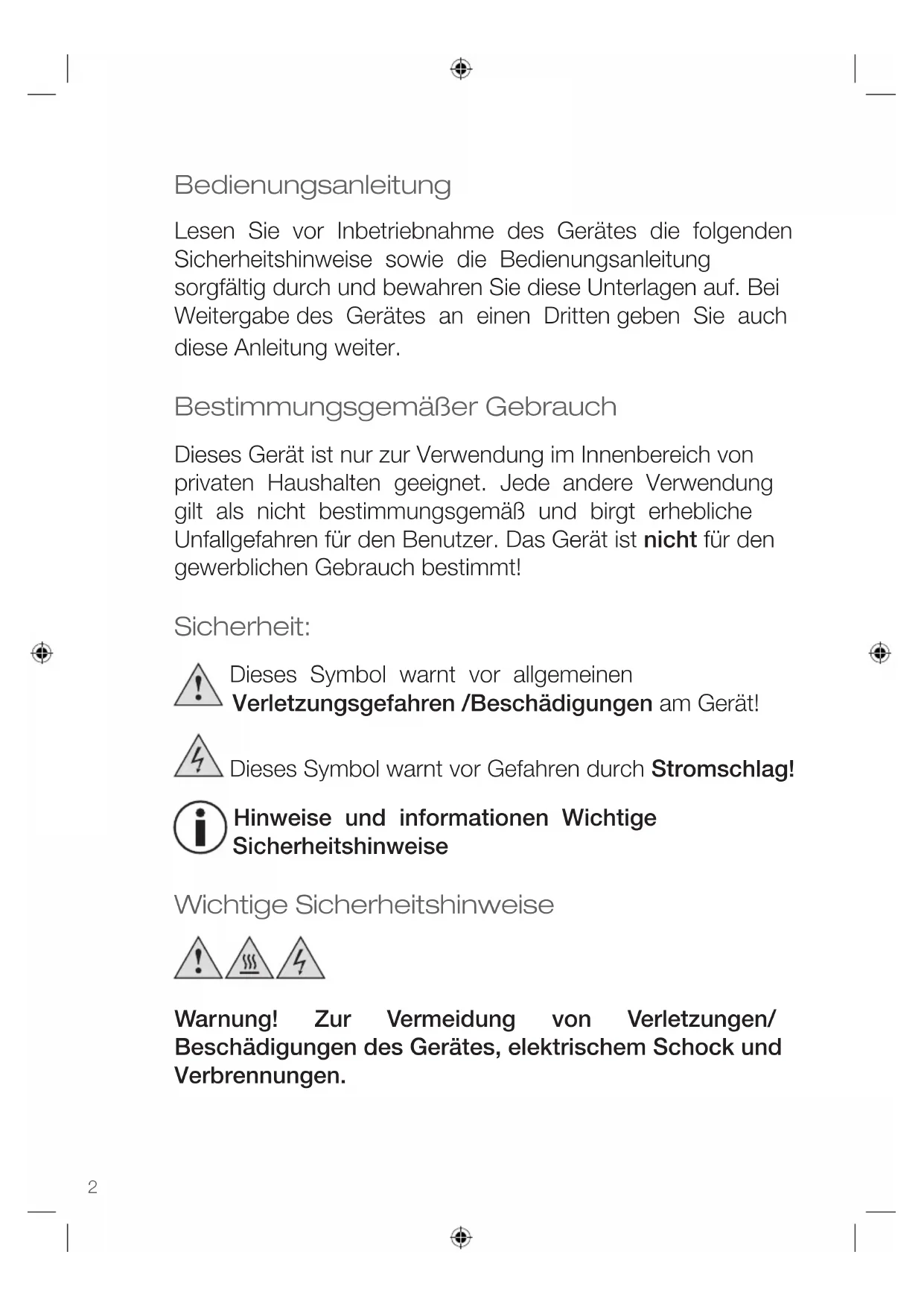 Bedienungsanleitung Lesen Sie vor Inbetriebnahme des Gerätes die folgenden Sicherheitshinweise sowie die Bedienungsanleitung sorgfältig durch und bewahren Sie diese Unterlagen auf. Bei Weitergabe des Gerätes an einen Dritten geben Sie auch diese Anleitung weiter. Bestimmungsgemäßer Gebrauch Dieses Gerät ist nur zur Verwendung im Innenbereich von privaten Haushalten geeignet. Jede andere Verwendung gilt als nicht bestimmungsgemäß und birgt erhebliche Unfallgefahren für den Benutzer. Das Gerät ist nicht für den gewerblichen Gebrauch bestimmt! Sicherheit: Dieses Symbol warnt vor allgemeinen Verletzungsgefahren /Beschädigungen am Gerät! Dieses Symbol warnt vor Gefahren durch Stromschlag! Hinweise und informationen Wichtige Sicherheitshinweise Wichtige Sicherheitshinweise Warnung! Zur Vermeidung von Verletzungen/ Beschädigungen des Gerätes, elektrischem Schock und Verbrennungen.DEUTSCH Bedienungsanleitung