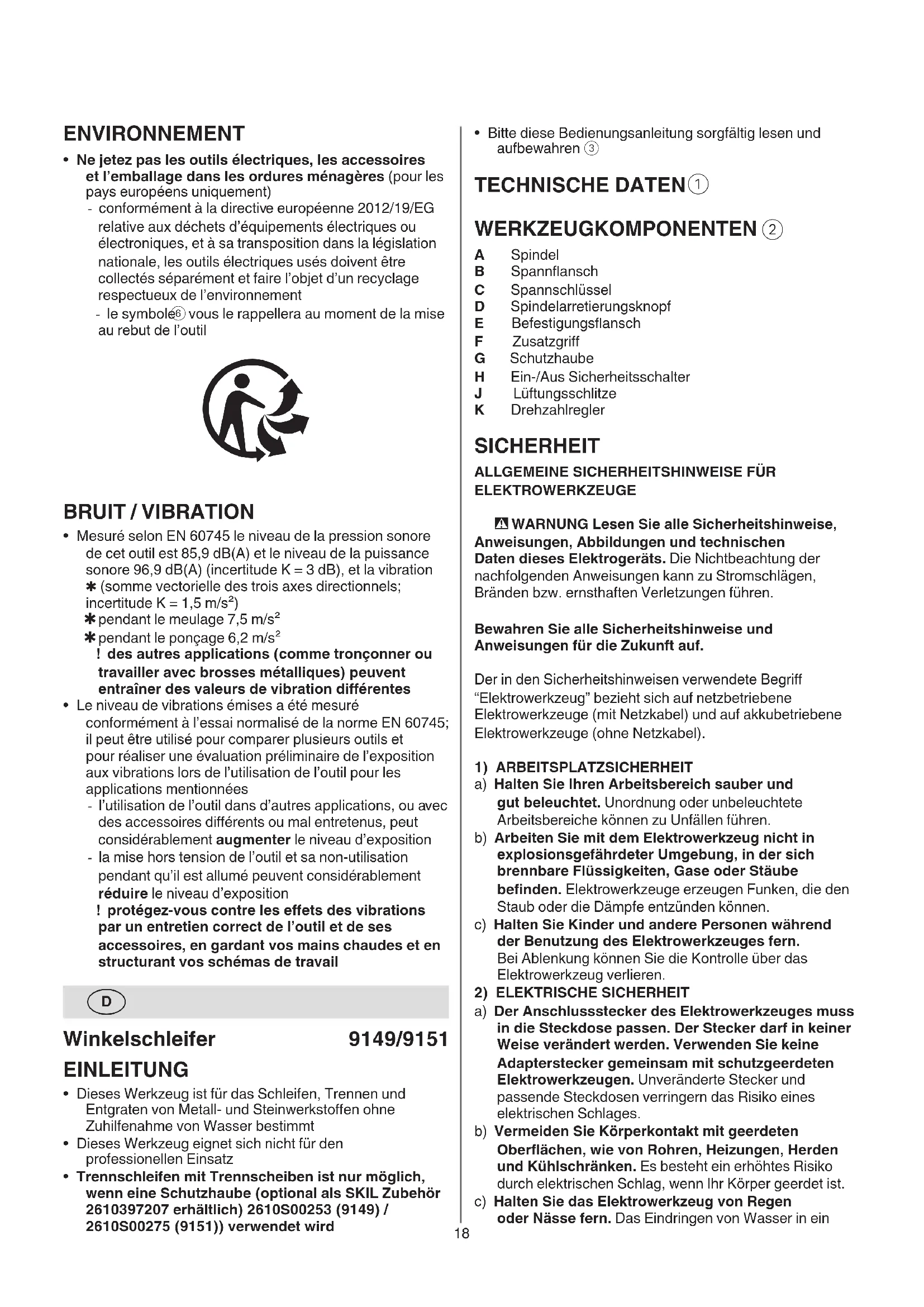 - Trennschleifen mit Trennscheiben ist nur möglich, wenn eine Schutzhaube (optional als SKIL Zubehör 2610397207 erhältlich) 2610S00253 (9149) / 2610S00275 (9151)) verwendet wird19 verwendet werden. Verwendung einer Staubabsaugung verringert Gefährdungen durch Staub. h) Wiegen Sie sich nicht in falscher Sicherheit und setzen Sie sich nicht über die Sicherheitsregeln für Elektrowerkzeuge hinweg, auch wenn Sie nach vielfachem Gebrauch mit dem Elektrowerkzeug vertraut sind. Achtloses Handeln kann binnen Sekundenbruchteilen zu schweren Verletzungen führen.