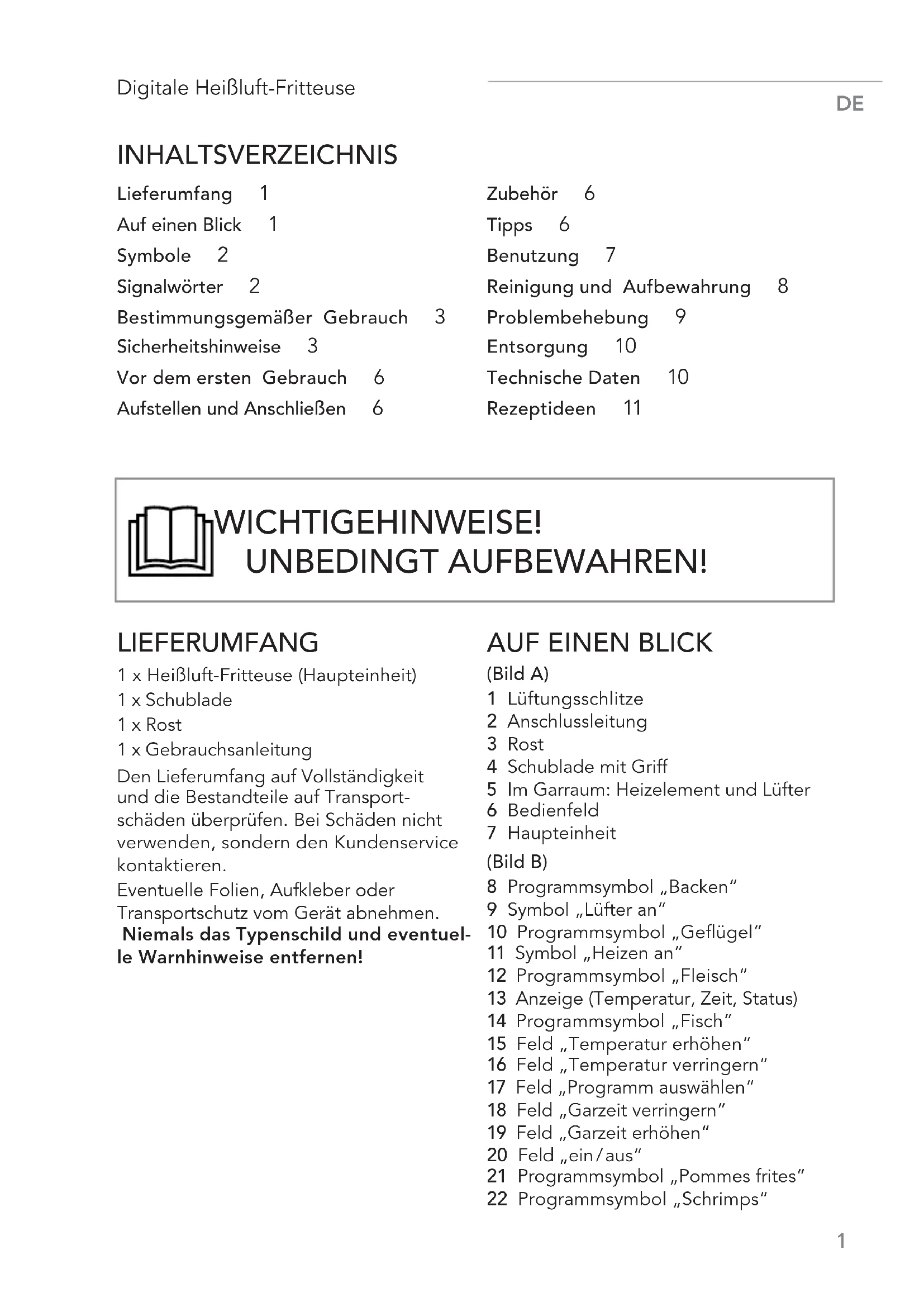 INHALTSVERZEICHNIS Lieferumfang 1 Auf einen Blick 1 Symbole 2 Signalwörter 2 Bestimmungsgemäßer Gebrauch 3 Sicherheitshinweise 3 Vor dem ersten Gebrauch 6 Aufstellen und Anschließen 6 Zubehör 6 Tipps 6 Benutzung 7 Reinigung und Aufbewahrung 8 Problembehebung 9 Entsorgung 10 Technische Daten 10 Rezeptideen 11 LIEFERUMFANG 1 x Heißluft-Fritteuse (Haupteinheit) 1 x Schublade 1 x Rost 1 x Gebrauchsanleitung Den Lieferumfang auf Vollständigkeit und die Bestandteile auf Transport- schäden überprüfen. Bei Schäden nicht verwenden, sondern den Kundenservice kontaktieren. Eventuelle Folien, Aufkleber oder Transportschutz vom Gerät abnehmen. Niemals das Typenschild und eventuel- le Warnhinweise entfernen!