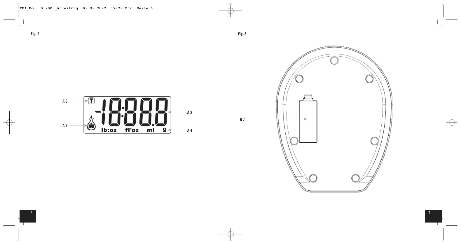 Instrukcja obsługi Fig. 1 A 1 A 2A 3 TFA_No. 50.2007_Anleitung 03.03.2022 17:23 Uhr Seite 376 Fig. 2 A 6 A 5 Fig. 3 A 7 A 2 A 4 TFA_No. 50.2007_Anleitung 03.03.2022 17:23 Uhr Seite 498 Digitale Küchenwaage