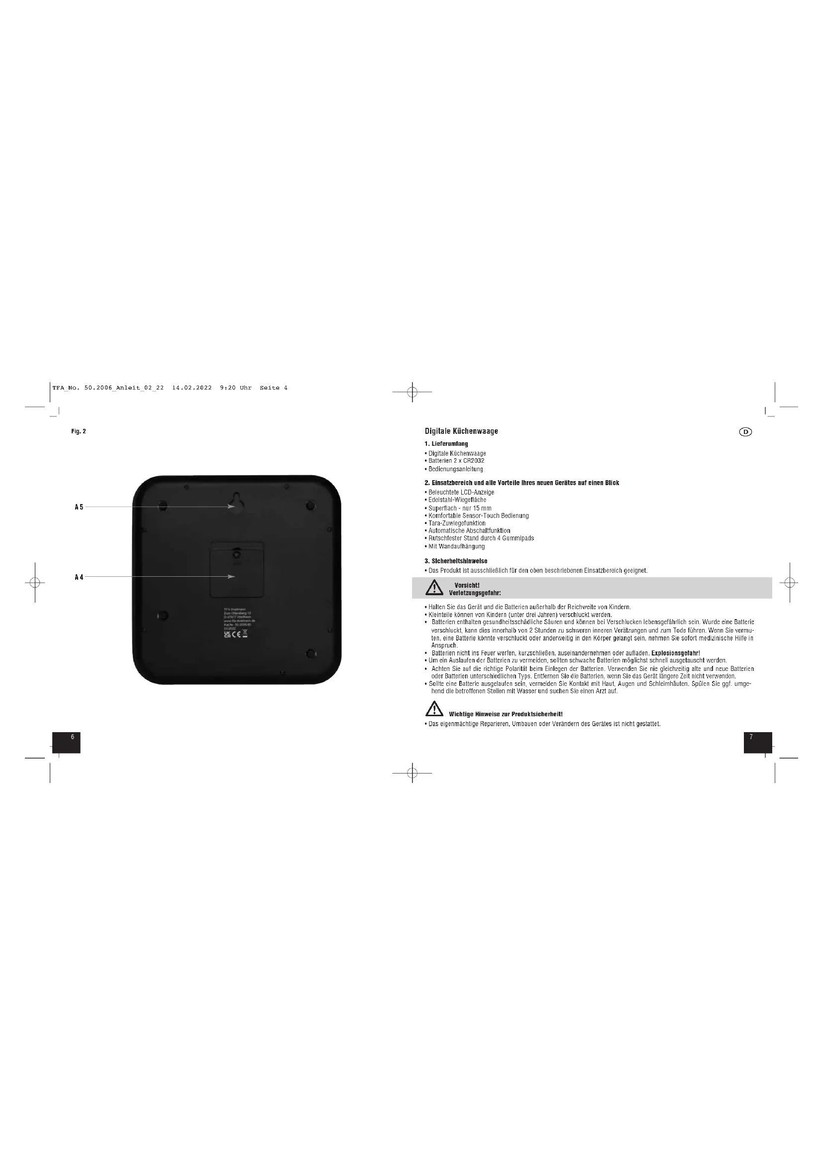 - Das eigenmächtige Reparieren, Umbauen oder Verändern des Gerätes ist nicht gestattet. Fig. 2 A 5 A 4 TFA_No. 50.2006_Anleit_02_22 14.02.2022 9:20 Uhr Seite 498 Digitale Küchenwaage