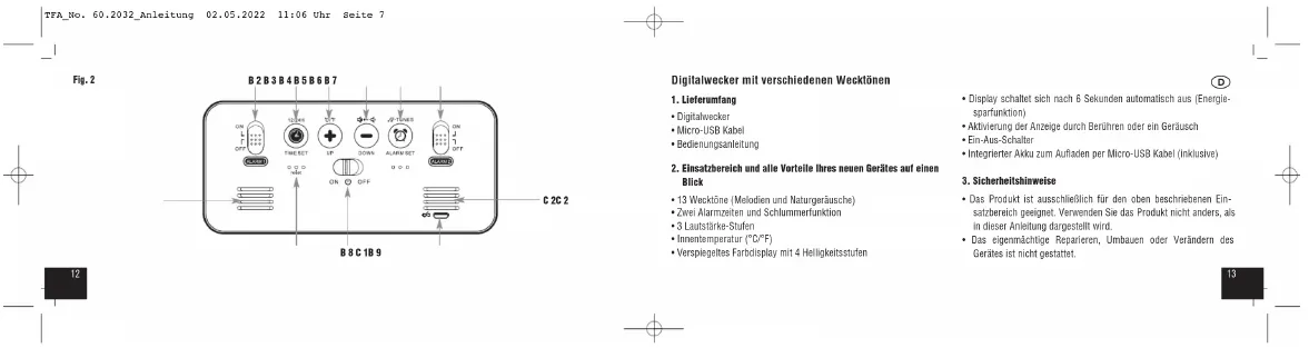 - Das eigenmächtige Reparieren, Umbauen oder Verändern des Gerätes ist nicht gestattet. B 8 C 1B 9 C 2C 2 B 2 B 3 B 4 B 5 B 6 B 7 TFA_No. 60.2032_Anleitung 02.05.2022 11:06 Uhr Seite 71514 Digitalwecker mit verschiedenen Wecktönen