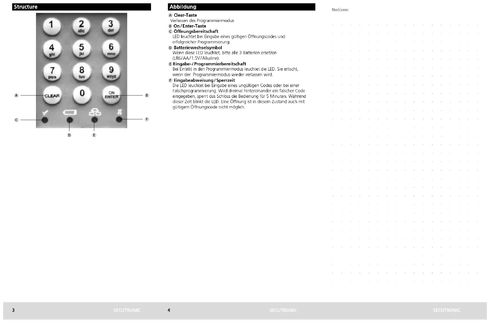 Инструкция по эксплуатации οδηγίες χειρισμου Kasutusjuhend Lietošanas instrukcija Kullanma Kılavuzu Naudojimo instrukcijos DOWNLOADStructure Abbildung Clear-Taste Verlassen des Programmiermodus On / Enter-Taste Öffnungsbereitschaft LED leuchtet bei Eingabe eines gültigen Öffnungscodes und erfolgreicher Programmierung Batteriewechselsymbol Wenn diese LED leuchtet, bitte alle 3 Batterien ersetzen (LR6 / AA / 1.5V / Alkaline). Eingabe- / Programmierbereitschaft Bei Eintritt in den Programmiermodus leuchtet die LED. Sie erlischt, wenn der Programmiermodus wieder verlassen wird. Eingabeabweisung / Sperrzeit Die LED leuchtet bei Eingabe eines ungültigen Codes oder bei einer Falschprogrammierung. Wird dreimal hintereinander ein falscher Code eingegeben, sperrt das Schloss die Bedienung für 5 Minuten. Während dieser Zeit blinkt die LED. Eine Öffnung ist in diesem Zustand auch mit gültigem Öffnungscode nicht möglich.