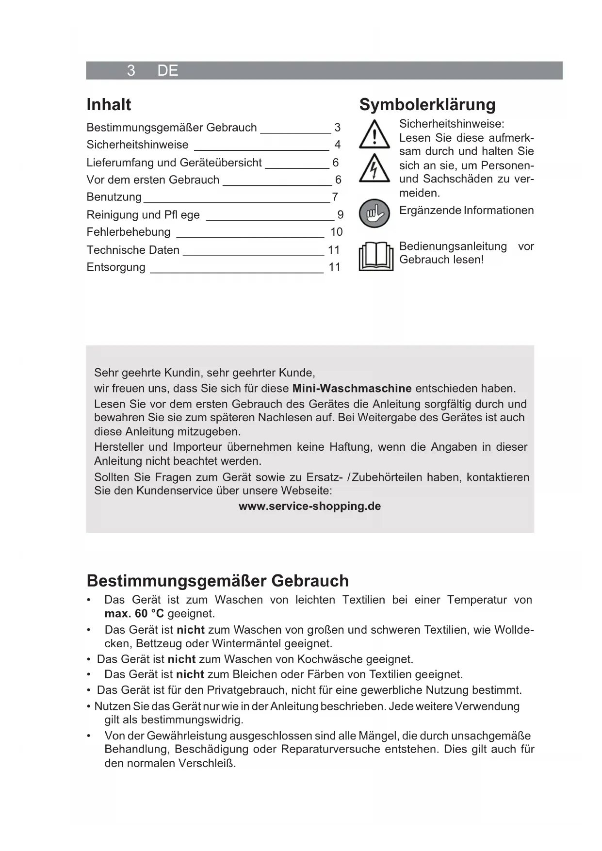 - Von der Gewährleistung ausgeschlossen sind alle Mängel, die durch unsachgemäße Behandlung, Beschädigung oder Reparaturversuche entstehen. Dies gilt auch für den normalen Verschleiß. Sehr geehrte Kundin, sehr geehrter Kunde, wir freuen uns, dass Sie sich für diese Mini-Waschmaschine entschieden haben. Lesen Sie vor dem ersten Gebrauch des Gerätes die Anleitung sorgfältig durch und bewahren Sie sie zum späteren Nachlesen auf. Bei Weitergabe des Gerätes ist auch diese Anleitung mitzugeben. Hersteller und Importeur übernehmen keine Haftung, wenn die Angaben in dieser Anleitung nicht beachtet werden. Sollten Sie Fragen zum Gerät sowie zu Ersatz- / Zubehörteilen haben, kontaktieren Sie den Kundenservice über unsere Webseite: www.service-shopping.de Symbolerklärung Sicherheitshinweise: Lesen Sie diese aufmerk- sam durch und halten Sie sich an sie, um Personen- und Sachschäden zu ver- meiden. Ergänzende Informationen Bedienungsanleitung vor Gebrauch lesen!DE 4 Sicherheitshinweise ■ Dieses Gerät ist nicht dafür bestimmt, durch Personen (ein- schließlich Kinder) mit eingeschränkten physischen, senso- rischen oder geistigen Fähigkeiten oder mangels Erfahrung und / oder mangels Wissen benutzt zu werden, es sei denn, sie werden durch eine für ihre Sicherheit zuständige Person beauf- sichtigt oder erhielten von ihr Anweisungen, wie das Gerät zu benutzen ist. ■ Kinder müssen beaufsichtigt werden, um sicherzustellen, dass sie nicht mit dem Gerät spielen. ■ Das Gerät ist bei nicht vorhandener Aufsicht und vor dem Zu- sammenbau, dem Auseinandernehmen oder Reinigen stets vom Netz zu trennen. ■ Gehen Sie nie über die maximale Füllmenge hinaus (MAX- Markierung beachten!). Ist die Waschmaschine überfüllt, könnte Wasser aus dem Abfl ussschlauch während des Waschvorgangs austreten. ■ Nehmen Sie keine Veränderungen am Gerät vor. Tauschen Sie auch das Netzkabel nicht selbst aus. Wenn das Gerät, die Anschlussleitung oder der Stecker des Gerätes beschädigt ist, muss es durch den Hersteller oder Kundenservice oder eine ähnlich qualifi zierte Person (z. B. Fachwerkstatt) ersetzt werden, um Gefährdungen zu vermeiden. Verletzungsgefahren ■ Halten Sie Kinder und Tiere vom Gerät und Verpackungsmate rial fern. Es besteht Verletzungs- und Erstickungsgefahr! ■ Fassen Sie niemals in die Schleudertrommel, bevor diese vollständig gestoppt hat. ■ Stellen Sie bei nicht vorhandener Aufsicht sicher, dass das Gerät kein Wasser enthält. ■ Verlegen Sie das Kabel so, dass es keine Stolpergefahr darstellt. ■ Stellen Sie das Gerät so auf, dass man es nicht am Kabel herunterziehen oder daran hängen bleiben kann. Stromschlag- und Brandgefahr ■ Schließen Sie das Gerät nur an eine vorschriftsmäßig installierte Steckdose mit Schutzkontakten an. Die Steckdose muss auch nach dem Anschließen gut zugäng- lich sein, damit die Netzverbindung schnell getrennt werden kann. Die Netzspan- nung muss mit den technischen Daten des Gerätes übereinstimmen. Verwenden5 DE Sie nur ordnungsgemäße Verlängerungskabel, deren technische Daten mit denen des Gerätes übereinstimmen. ■ Tauchen Sie das Gerät, das Netzkabel und den Stecker niemals in Wasser oder andere Flüssigkeiten ein und stellen Sie sicher, dass diese nicht in Wasser fallen oder nass werden können. ■ Sollte das Gerät ins Wasser fallen, unterbrechen Sie sofort die Stromzufuhr. Ver- suchen Sie nicht, es aus dem Wasser zu ziehen, während es am Stromnetz ange- schlossen ist! ■ Verwenden Sie das Gerät nicht, wenn es eine Fehlfunktion hatte, heruntergefallen oder ins Wasser gefallen ist. Lassen Sie es vor der Inbetriebnahme in einer Fach- werkstatt überprüfen. ■ Berühren Sie das Netzkabel und den Stecker niemals mit feuchten Händen, wenn diese Komponenten an das Stromnetz angeschlossen sind. ■ Schalten Sie das Gerät aus und ziehen Sie den Netzstecker aus der Steckdose, wenn während des Betriebes ein Fehler auftritt oder vor einem Gewitter. ■ Ziehen Sie immer am Stecker und nie am Netzkabel. ■ Verwenden Sie das Gerät nur in geschlossenen Räumen. ■ Verwenden Sie das Gerät nicht in Räumen, in denen sich leichtentzündlicher Staub oder giftige sowie explosive Dämpfe befi nden. ■ Geben Sie niemals Kleidung in das Gerät, die vor kurzem mit Lösungsmitteln wie z. B. Waschbenzin in Berührung gekommen sind. ■ Betreiben Sie das Gerät nicht in einer sehr feuchten Umgebung oder in der Nähe von brennbarem Material. ■ Überprüfen Sie das Gerät vor jeder Inbetriebnahme auf Beschädigungen. Benutzen Sie es nur, wenn das Gerät, das Netzkabel und der Stecker keine Schäden aufweisen! Vermeiden von Material-, Sach- und Geräteschäden ■ Stellen Sie das Gerät immer auf einen trockenen, ebenen, festen und feuchtigkeits- beständigen Untergrund. ■ Achten Sie darauf, dass der Abfl ussschlauch, der Zufl ussschlauch und das Netzka- bel nicht gequetscht, geknickt oder über scharfe Kanten gelegt werden und nicht mit heißen Flächen in Berührung kommen. ■ Verwenden Sie nur im Lieferumfang enthaltenes oder vom Hersteller empfohlenes Zubehör. ■ Halten Sie ausreichend Abstand zu Wärmequellen wie Herdplatten oder Öfen, um Geräteschäden zu vermeiden. Stellen Sie kein offenes Feuer, z. B. brennende Kerzen, in die direkte Nähe des Gerätes, Kabels und Steckers. ■ Stellen Sie keine schweren oder heißen Gegenstände auf das Gerät. ■ Lassen Sie das Gerät nicht fallen und setzen Sie es keinen starken Stößen aus. ■ Setzen Sie das Gerät keinen extremen Temperaturen, starken Temperaturschwan- kungen, Nässe oder direkter Sonneneinstrahlung aus. ■ Es darf kein Wasser wärmer als 60 °C verwendet werden, da sich ansonsten die Plas- tikwanne verformen könnte.DE 6 ■ Nehmen Sie alle Gegenstände, wie Schlüssel, Kleingeld etc., aus Taschen o.Ä., um Beschädigungen an den Textilien und dem Gerät zu vermeiden. ■ Verwenden Sie zum Reinigen des Gerätes keine ätzenden oder scheuernden Re