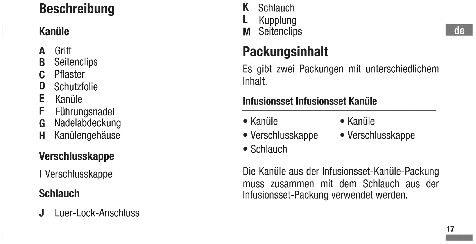 Seitenclips Packungsinhalt Es gibt zwei Packungen mit unterschiedlichem Inhalt. Infusionsset Infusionsset Kanüle