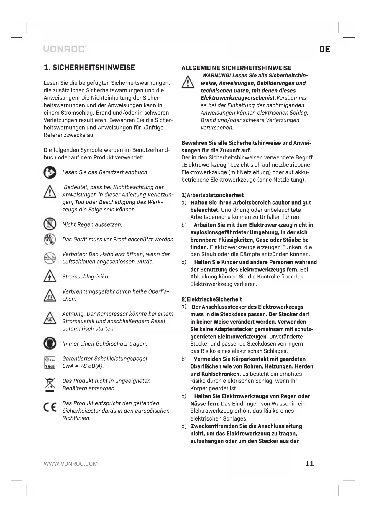 - Ob die Stromversorgung gewährleistet ist (Ste- cker richtig angeschlossen, magnetothermische Sicherungen nicht defekt). Der Kompressor schaltet sich nicht ab Wenn der Kompressor bei Erreichen des Höchst- drucks nicht abschaltet, wird das Sicherheitsventil des Behälters aktiviert. Kontaktieren Sie für die Reparatur die nächste autorisierte Kundendienst- werkstatt. UMWELT Fehlerhafte und/oder ausgesonderte elektrische oder elektronische Geräte müssen zu den entsprechenden Recycling- orten gebracht werden. Nur für EU-Länder Entsorgen Sie Elektrowerkzeuge nicht im Haus- müll. Nach der europäischen Richtlinie 2012/19/ EU über Elektro- und Elektronik-Altgeräte und ihrer Umsetzung in nationales Recht müssen Elekt- rowerkzeuge, die nicht mehr verwendet werden sollen, getrennt gesammelt und auf umweltgerech- te Weise entsorgt werden. GARANTIE VONROC-Produkte werden nach den höchsten Qua- li täts stan dards entwickelt und sind für den gesetz- lich festgelegten Zeitraum, ausgehend von dem ur- sprüng lichen Kauf datum, garantiert frei von Fehlern in Material und Aus führ ung. Sollte das Produkt in diesem Zeitraum aufgrund von Material- und/oder Ver ar bei tungs mängeln Fehler aufweisen, wenden Sie sich bitte direkt an VONROC Kundendienst. Folgende Umstände sind von der Garantie ausge- schlossen: