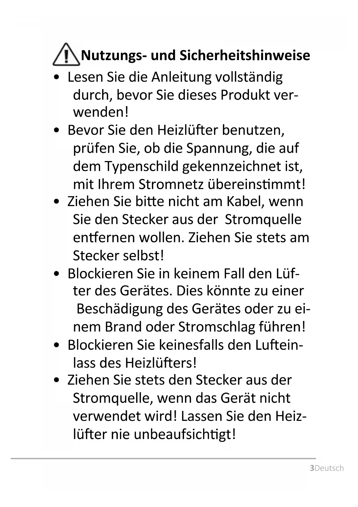 - Ziehen Sie stets den Stecker aus der Stromquelle, wenn das Gerät nicht verwendet wird! Lassen Sie den Heiz- lüer nie unbeaufsichgt!4 Deutsch
