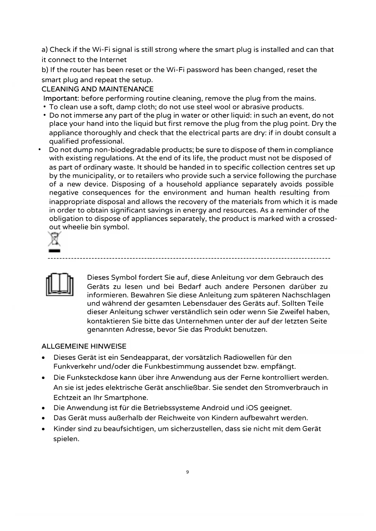 Keinen Teil der Funksteckdose in Wasser oder andere Flüssigkeiten tauchen. Sollte dies Dennoch vorkommen, nicht mit den Händen in die Flüssigkeit greifen, sondern erst den Netzstecker aus der Steckdoseziehen. Das Gerät sorgfältig abtrocknen und prufen, dass alle seine elektrischen Teile trocken sind; sich im Zweifelsfall an einen qualifizierten Fachmann wenden.