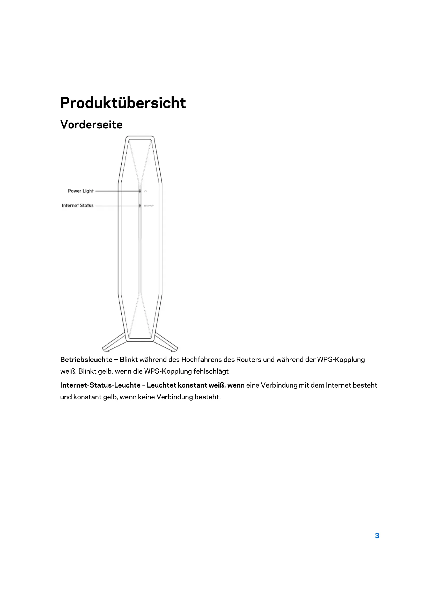 - Betriebsbedingungen Produktübersicht Vorderseite Betriebsleuchte - -- Blinkt während des Hochfahrens des Routers und während der WPS-Kopplung weiß. Blinkt gelb, wenn die WPS-Kopplung fehlschlägt Internet-Status-Leuchte – Leuchtet konstant weiß, wenn eine Verbindung mit dem Internet besteht und konstant gelb, wenn keine Verbindung besteht.4 Rückseite Wi-Fi Protected Setup™-Taste (WPS) (1) – Durch Drücken dieser Taste, können Sie im Nu WLAN- Sicherheit auf Wi-Fi Protected Setup-fähigen Netzwerkgeräten konfigurieren. Die Leuchte unter der Taste blinkt während der WPS-Kopplung. Reset-Taste (2) – Halten Sie diese Taste gedrückt, bis die Betriebsleuchte anfängt zu blinken, um den Router auf die Werkseinstellungen zurückzusetzen. Ethernet-Ports (3) - -- Kabelgebundene Geräte lassen sich zur Einbindung in Ihr Netzwerk mit Ethernet-Kabeln (auch Netzwerkkabel oder Internetkabel genannt) an diese Fast Ethernet-Ports (10/100/1000) anschließen. Die Leuchten unter den Anschlüssen leuchten nur bei Datenverkehr über ein angeschlossenes Ethernet-Kabel auf. Internet-Port (4) - -- Ihr Modem lässt sich mit einem Ethernet-Kabel an diesen Port anschließen. Die Leuchte unter dem Anschluss leuchtet nur bei Datenverkehr über ein angeschlossenes Ethernet- Kabel auf. USB 3.0-Port (5) – Hier können Sie einen USB-Stick anschließen, den Sie für das ganze Netzwerk freigeben können. Stromanschluss (6) - -- Hier können Sie das enthaltene Netzteil anschließen. Ein/Aus-Schalter (7) – Drücken Sie | (ON) [Ein], um den Router einzuschalten.5 Einrichtung: Grundlagen Hier finden Sie weitere Unterstützung Außer in diesem Benutzerhandbuch erhalten Sie unter Belkin.com/support/RT1800 Hilfe in Form von Dokumentation, Downloads, FAQs (häufig gestellten Fragen), technischem Support, Live-Chats und Foren. Hinweis: Lizenzen und Hinweise zur Software Dritter, die auf diesem Produkt zum Einsatz kommt, finden Sie hier: https://www.belkin.com/support/license/ . Antworten auf Fragen und Informationen zum GPL-Quellcode finden Sie unter: https://www.belkin.com/support/gplcodecenter/. Ihren Router installieren Möchten Sie diesen Router in Ihrem vorhandenen Mesh-WLAN hinzufügen? Wenn Sie diesen Router bereits benutzt haben, setzen Sie ihn auf die Werkseinstellungen zurück, bevor Sie ihn in Ihrem Mesh-WLAN hinzufügen. Dies können Sie über die Registerkarte Administration (Verwaltung) in den Router-Einstellungen tun oder indem Sie 10 Sekunden lang die Reset-Taste auf der Rückseite des Routers drücken. p. 223