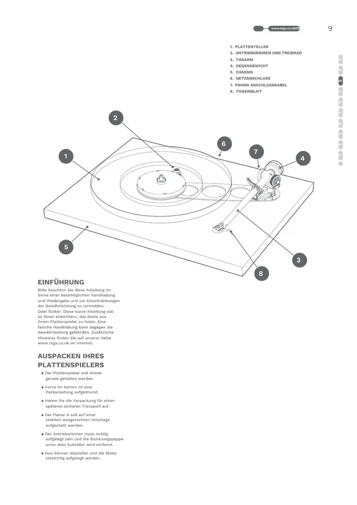 EINFÜHRUNG Bie beachten Sie diese Anleitung im Sinne einer bestmöglichen Handhabung und Wiedergabe und um Einschränkungen der Gewährleistung zu vermeiden. Oder floer: Diese kurze Anleitung soll es Ihnen erleichtern, das Beste aus Ihrem Plaenspieler zu holen. Eine falsche Handhabung kann dagegen die Gewährleistung gefährden. Zusätzliche Hinweise finden Sie auf unserer Seite www.rega.co.uk im Internet. AUSPACKEN IHRES PLATTENSPIELERS ● Der Plaenspieler soll immer gerade gehalten werden. ● Vorne im Karton ist eine Packanleitung aufgedruckt. ● Heben Sie die Verpackung für einen späteren sicheren Transport auf. ● Der Planar 6 soll auf einer stabilen waagerechten Unterlage aufgestellt werden. ● Der Antriebsriemen muss richtig aufgelegt sein und die Sicherungspappe unter dem Subteller wird entfernt. ● Nun können Glasteller und die Mae vorsichtig aufgelegt werden.