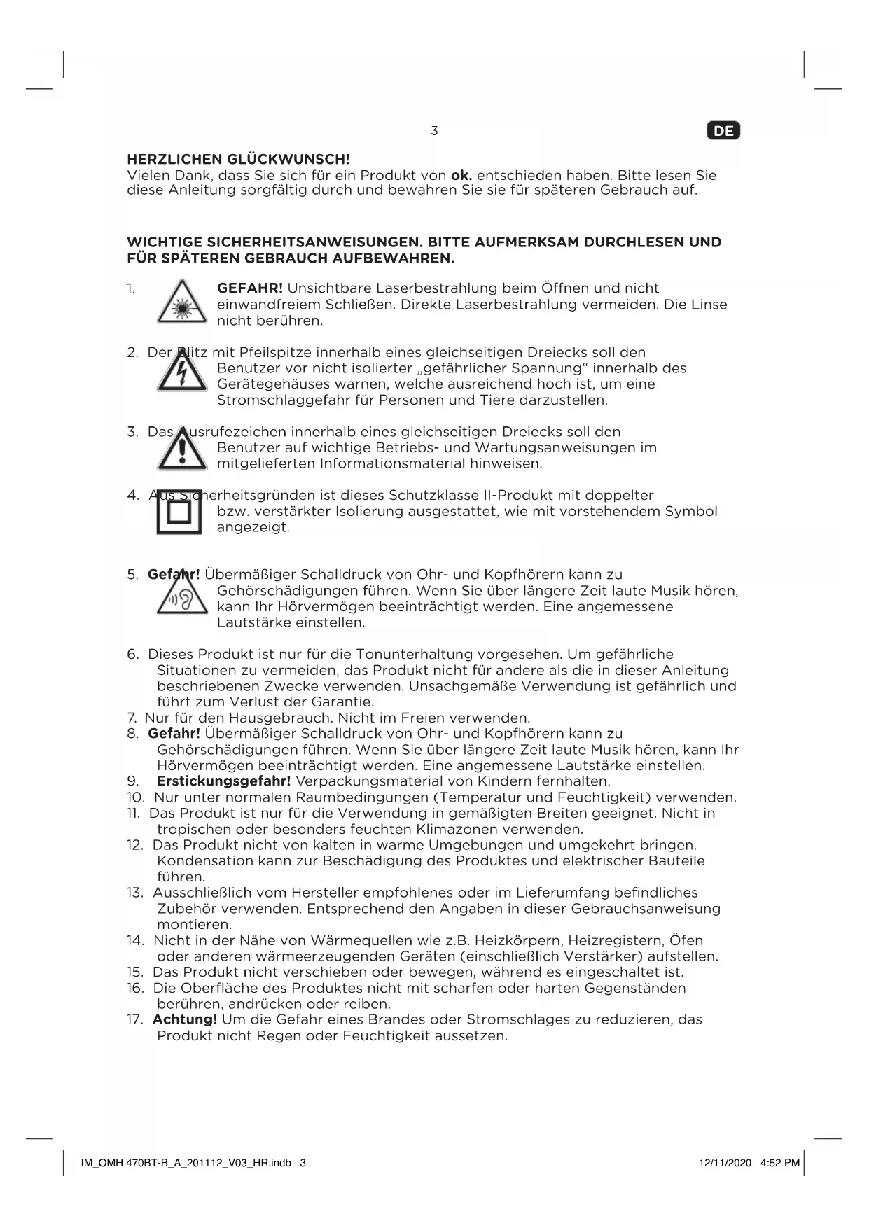 Produkt nicht Regen oder Feuchtigkeit aussetzen. IM_OMH 470BT-B_A_201112_V03_HR.indb 3IM_OMH 470BT-B_A_201112_V03_HR.indb 3 12/11/2020 4:52 PM12/11/2020 4:52 PM4 DEDE