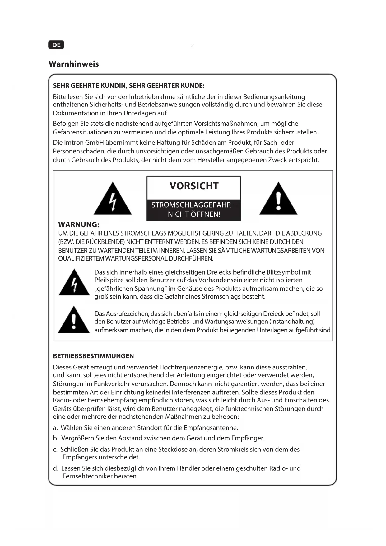 SEHR GEEHRTE KUNDIN, SEHR GEEHRTER KUNDE: Bitte lesen Sie sich vor der Inbetriebnahme sämtliche der in dieser Bedienungsanleitung enthaltenen Sicherheits- und Betriebsanweisungen vollständig durch und bewahren Sie diese Dokumentation in Ihren Unterlagen auf. Befolgen Sie stets die nachstehend aufgeführten Vorsichtsmaßnahmen, um mögliche Gefahrensituationen zu vermeiden und die optimale Leistung Ihres Produkts sicherzustellen. Die Imtron GmbH übernimmt keine Haftung für Schäden am Produkt, für Sach- oder Personenschäden, die durch unvorsichtigen oder unsachgemäßen Gebrauch des Produkts oder durch Gebrauch des Produkts, der nicht dem vom Hersteller angegebenen Zweck entspricht. Warnhinweis WARNUNG: UM DIE GEFAHR EINES STROMSCHLAGS MÖGLICHST GERING ZU HALTEN, DARF DIE ABDECKUNG (BZW. DIE RÜCKBLENDE) NICHT ENTFERNT WERDEN. ES BEFINDEN SICH KEINE DURCH DEN BENUTZER ZU WARTENDEN TEILE IM INNEREN. LASSEN SIE SÄMTLICHE WARTUNGSARBEITEN VON QUALIFIZIERTEM WARTUNGSPERSONAL DURCHFÜHREN. Das sich innerhalb eines gleichseitigen Dreiecks bendliche Blitzsymbol mit Pfeilspitze soll den Benutzer auf das Vorhandensein einer nicht isolierten „gefährlichen Spannung“ im Gehäuse des Produkts aufmerksam machen, die so groß sein kann, dass die Gefahr eines Stromschlags besteht. Das Ausrufezeichen, das sich ebenfalls in einem gleichseitigen Dreieck bendet, soll den Benutzer auf wichtige Betriebs- und Wartungsanweisungen (Instandhaltung) aufmerksam machen, die in den dem Produkt beiliegenden Unterlagen aufgeführt sind. BETRIEBSBESTIMMUNGEN Dieses Gerät erzeugt und verwendet Hochfrequenzenergie, bzw. kann diese ausstrahlen, und kann, sollte es nicht entsprechend der Anleitung eingerichtet oder verwendet werden, Störungen im Funkverkehr verursachen. Dennoch kann nicht garantiert werden, dass bei einer bestimmten Art der Einrichtung keinerlei Interferenzen auftreten. Sollte dieses Produkt den Radio- oder Fernsehempfang empndlich stören, was sich leicht durch Aus- und Einschalten des Geräts überprüfen lässt, wird dem Benutzer nahegelegt, die funktechnischen Störungen durch eine oder mehrere der nachstehenden Maßnahmen zu beheben: a. Wählen Sie einen anderen Standort für die Empfangsantenne. b. Vergrößern Sie den Abstand zwischen dem Gerät und dem Empfänger. c. Schließen Sie das Produkt an eine Steckdose an, deren Stromkreis sich von dem des Empfängers unterscheidet. d. Lassen Sie sich diesbezüglich von Ihrem Händler oder einem geschulten Radio- und Fernsehtechniker beraten. VORSICHT STROMSCHLAGGEFAHR –