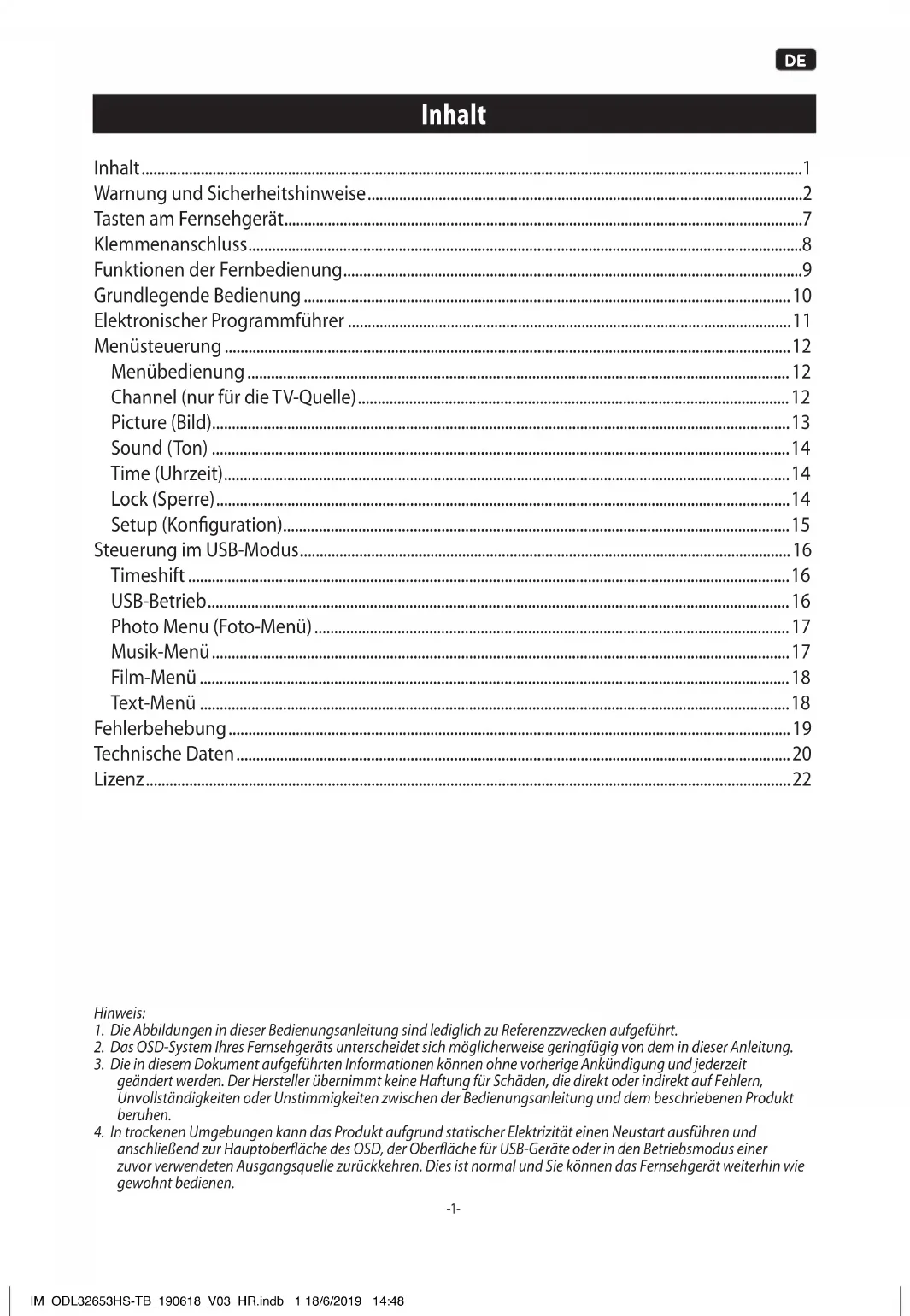 anschließend zur Hauptoberäche des OSD, der Oberäche für USB-Geräte oder in den Betriebsmodus einer zuvor verwendeten Ausgangsquelle zurückkehren. Dies ist normal und Sie können das Fernsehgerät weiterhin wie gewohnt bedienen. IM_ODL32653HS-TB_190618_V03_HR.indb 1 18/6/2019 14:48Size = A5