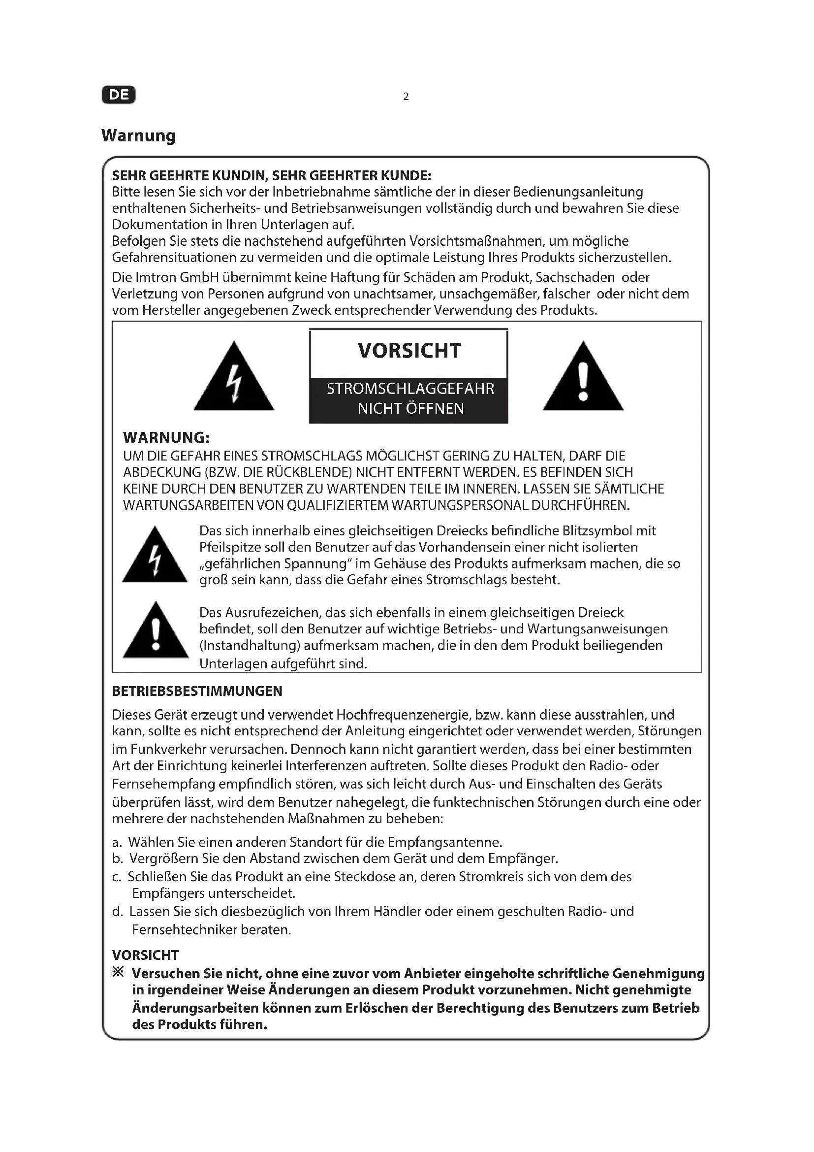 Versuchen Sie nicht, ohne eine zuvor vom Anbieter eingeholte schriftliche Genehmigung in irgendeiner Weise Änderungen an diesem Produkt vorzunehmen. Nicht genehmigte Änderungsarbeiten können zum Erlöschen der Berechtigung des Benutzers zum Betrieb des Produkts führen. VORSICHT STROMSCHLAGGEFAHR NICHT ÖFFNEN Die Imtron GmbH übernimmt keine Haftung für Schäden am Produkt, Sachschaden oder Verletzung von Personen aufgrund von unachtsamer, unsachgemäßer, falscher oder nicht dem vom Hersteller angegebenen Zweck entsprechender Verwendung des Produkts.DE