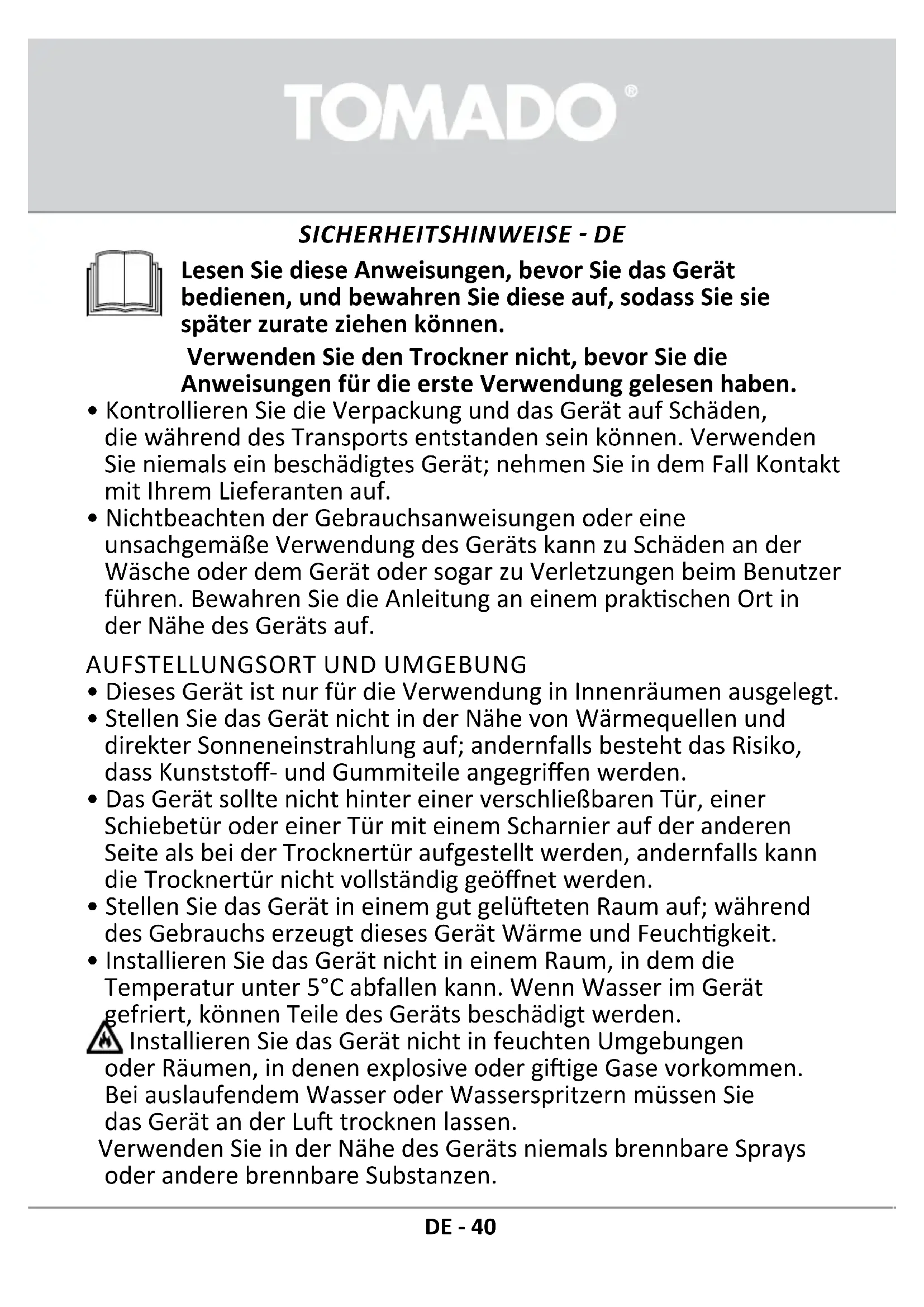 - Verwenden Sie nur Produkte, die speziell für das Trocknen von Wäsche entwickelt wurden. Tomado haftet nicht für Schäden oder Verfährungen bei Dichtungen und Kunststoffeilen, die durch den falschen Gebrauch von Bleichmitteln oder Farbstoffen verursacht werden.
