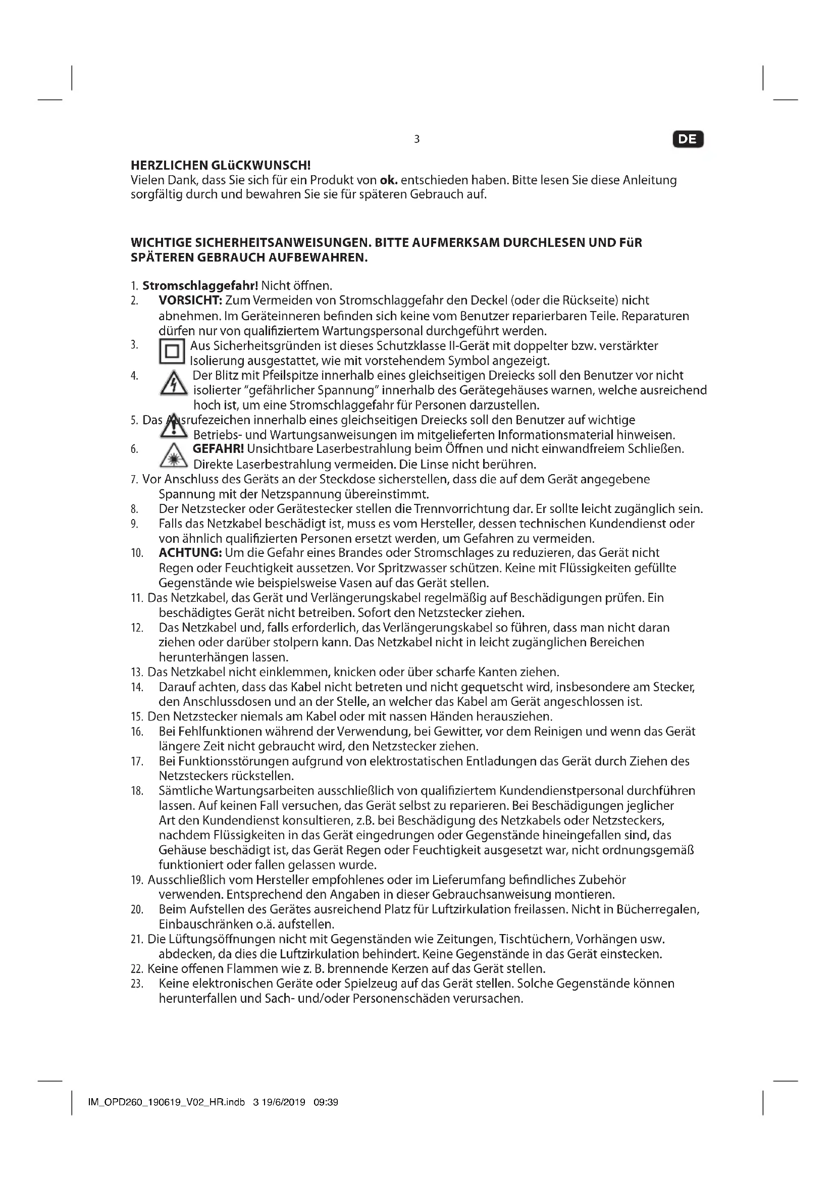 HERZLICHEN GLüCKWUNSCH! Vielen Dank, dass Sie sich für ein Produkt von ok. entschieden haben. Bitte lesen Sie diese Anleitung sorgfältig durch und bewahren Sie sie für späteren Gebrauch auf. WICHTIGE SICHERHEITSANWEISUNGEN. BITTE AUFMERKSAM DURCHLESEN UND FüR SPÄTEREN GEBRAUCH AUFBEWAHREN.