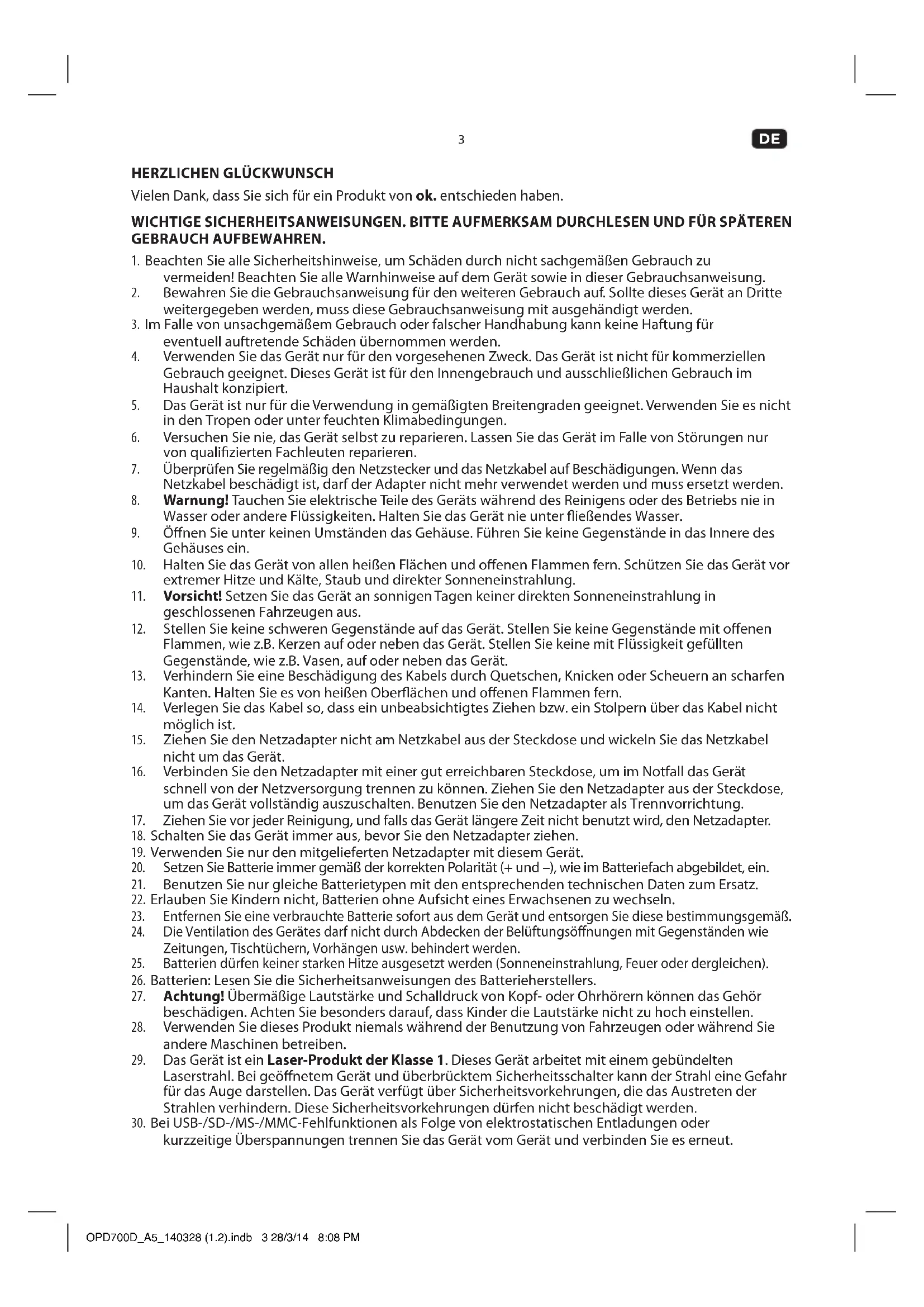 Vielen Dank, dass Sie sich für ein Produkt von ok. entschieden haben. WICHTIGE SICHERHEITSANWEISUNGEN. BITTE AUFMERKSAM DURCHLESEN UND FÜR SPÄTEREN GEBRAUCH AUFBEWAHREN.