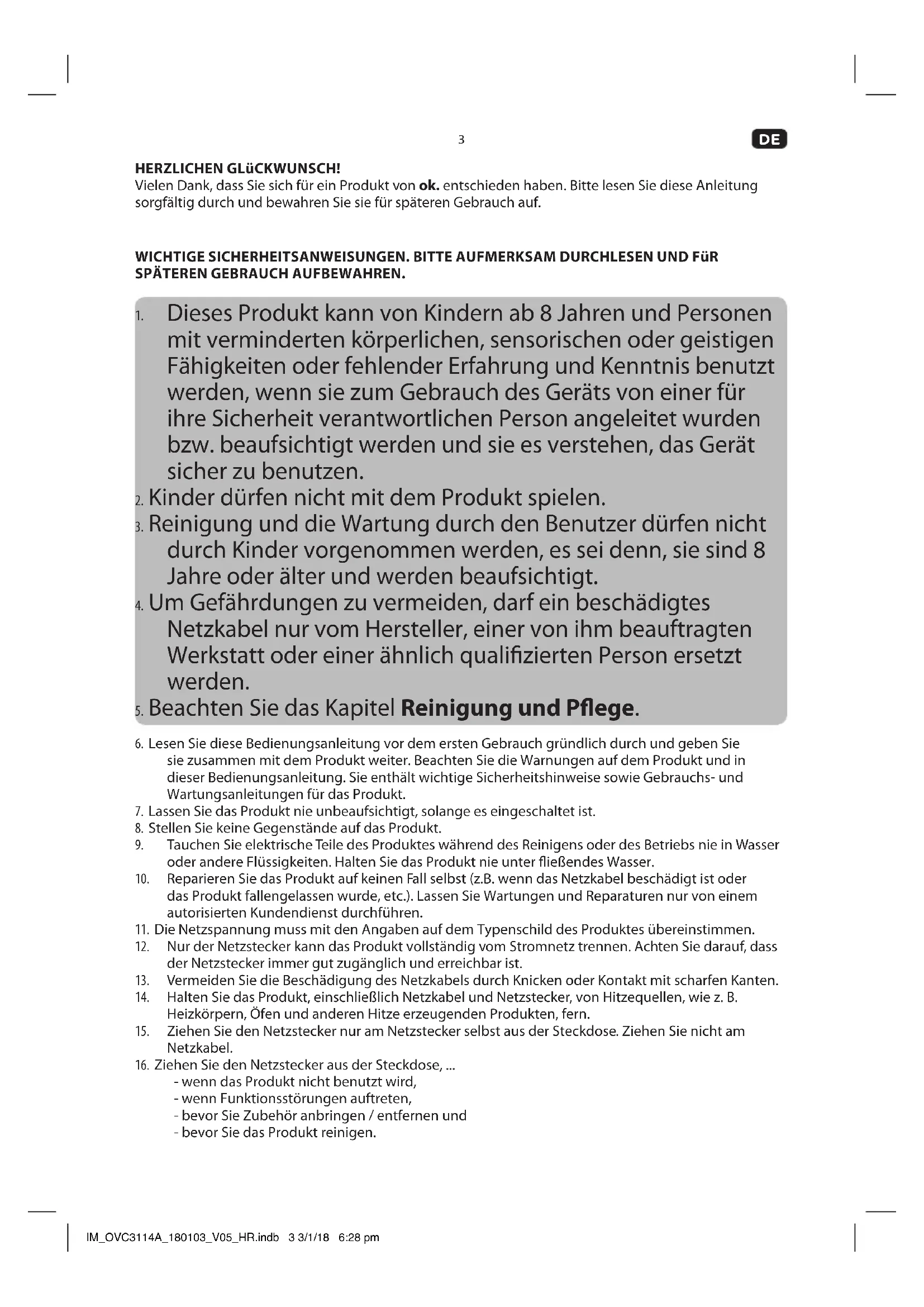 HERZLICHEN GLüCKWUNSCH! Vielen Dank, dass Sie sich für ein Produkt von ok. entschieden haben. Bitte lesen Sie diese Anleitung sorgfältig durch und bewahren Sie sie für späteren Gebrauch auf. WICHTIGE SICHERHEITSANWEISUNGEN. BITTE AUFMERKSAM DURCHLESEN UND FüR SPÄTEREN GEBRAUCH AUFBEWAHREN.