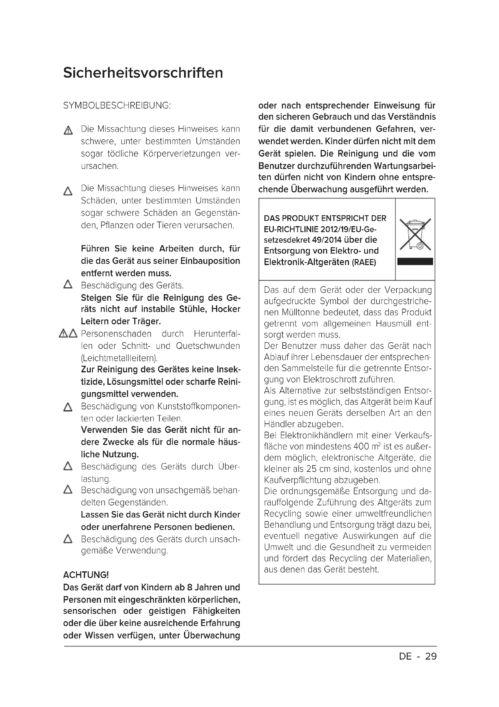 Err Le capteur de température ambiante est endommagé. Remplacer le capteur d’ambiance.DE - 29 Sicherheitsvorschriften SYMBOLBESCHREIBUNG: Die Missachtung dieses Hinweises kann schwere, unter bestimmten Umständen sogar tödliche Körperverletzungen ver- ursachen. Die Missachtung dieses Hinweises kann Schäden, unter bestimmten Umständen sogar schwere Schäden an Gegenstän- den, Pflanzen oder Tieren verursachen. Führen Sie keine Arbeiten durch, für die das Gerät aus seiner Einbauposition entfernt werden muss. Beschädigung des Geräts. Steigen Sie für die Reinigung des Ge- räts nicht auf instabile Stühle, Hocker Leitern oder Träger. Personenschaden durch Herunterfal- len oder Schnitt- und Quetschwunden (Leichtmetallleitern). Zur Reinigung des Gerätes keine Insek- tizide, Lösungsmittel oder scharfe Reini- gungsmittel verwenden. Beschädigung von Kunststokomponen- ten oder lackierten Teilen. Verwenden Sie das Gerät nicht für an- dere Zwecke als für die normale häus- liche Nutzung. Beschädigung des Geräts durch Über- lastung. Beschädigung von unsachgemäß behan- delten Gegenständen. Lassen Sie das Gerät nicht durch Kinder oder unerfahrene Personen bedienen. Beschädigung des Geräts durch unsach- gemäße Verwendung. ACHTUNG! Das Gerät darf von Kindern ab 8 Jahren und Personen mit eingeschränkten körperlichen, sensorischen oder geistigen Fähigkeiten oder die über keine ausreichende Erfahrung oder Wissen verfügen, unter Überwachung oder nach entsprechender Einweisung für den sicheren Gebrauch und das Verständnis für die damit verbundenen Gefahren, ver- wendet werden. Kinder dürfen nicht mit dem Gerät spielen. Die Reinigung und die vom Benutzer durchzuführenden Wartungsarbei- ten dürfen nicht von Kindern ohne entspre- chende Überwachung ausgeführt werden.