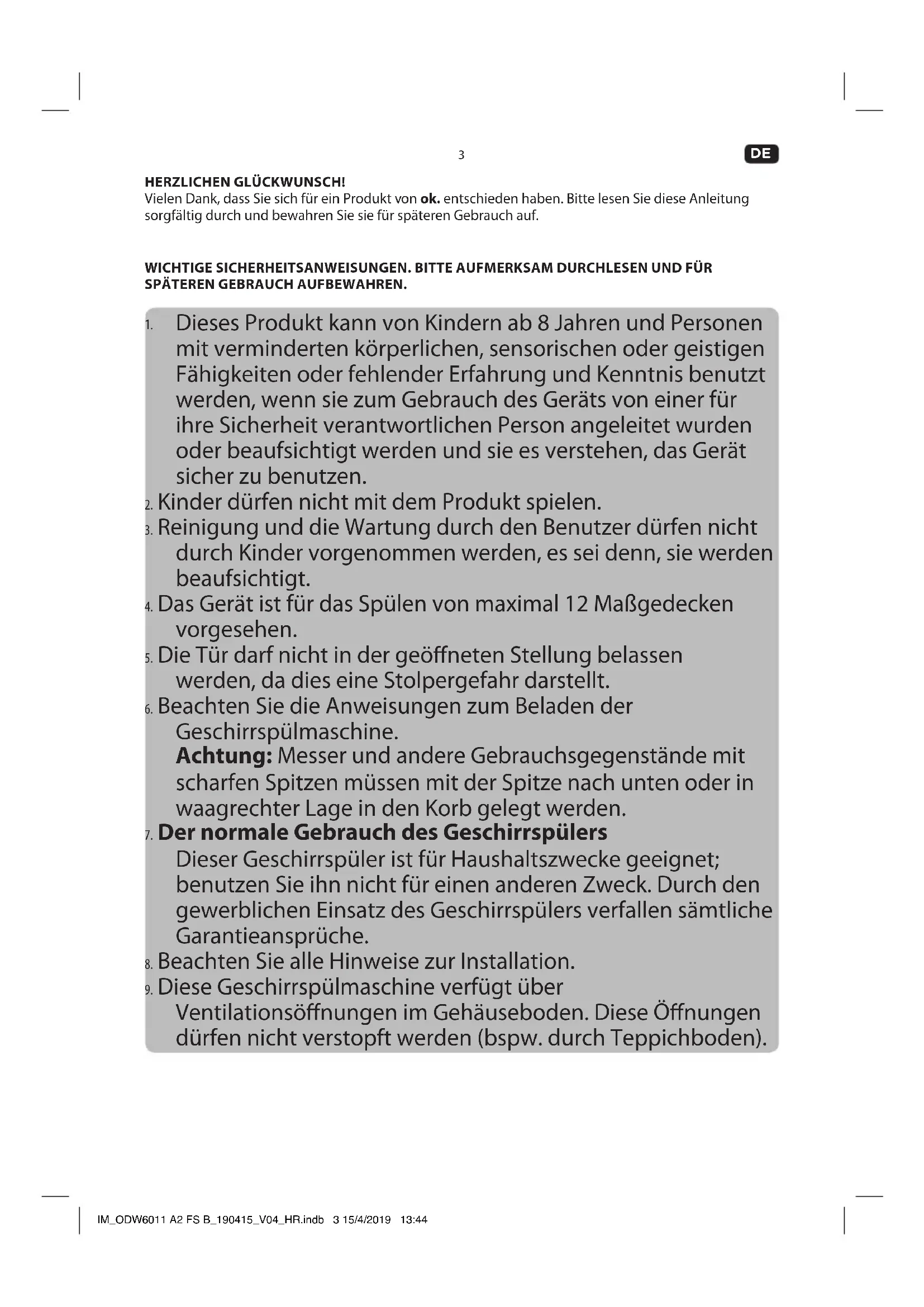 Dieses Produkt ist nur für das Reinigen von Geschirr und Besteck geeignet. Jeglicher anderer Gebrauch kann zu Schaden am Produkt oder Verletzungen führen. Das Gerät ist nur für die Benutzung im privaten Haushalt bestimmt und nicht für kommerziellen Gebrauch geeignet. Die Imtron GmbH übernimmt keine Haftung für Schäden am Produkt, Sachschaden, oder Verletzung von Personen aufgrund von unachtsamer, unsachgemäßer, falscher oder nicht dem vom Hersteller angegebenen Zweck entsprechender Verwendung des Produkts. IM_ODW6011 A2 FS B_190415_V04_HR.indb 4 15/4/2019 13:445