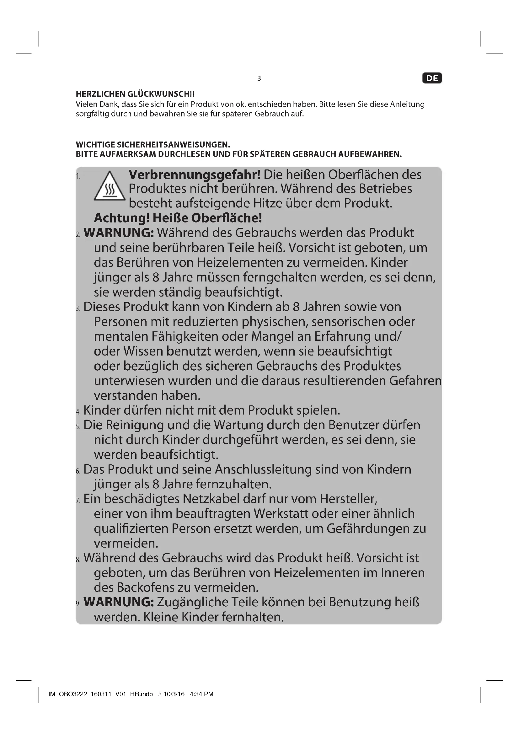 HERZLICHEN GLÜCKWUNSCH!! Vielen Dank, dass Sie sich für ein Produkt von ok. entschieden haben. Bitte lesen Sie diese Anleitung sorgfältig durch und bewahren Sie sie für späteren Gebrauch auf. WICHTIGE SICHERHEITSANWEISUNGEN. BITTE AUFMERKSAM DURCHLESEN UND FÜR SPÄTEREN GEBRAUCH AUFBEWAHREN.