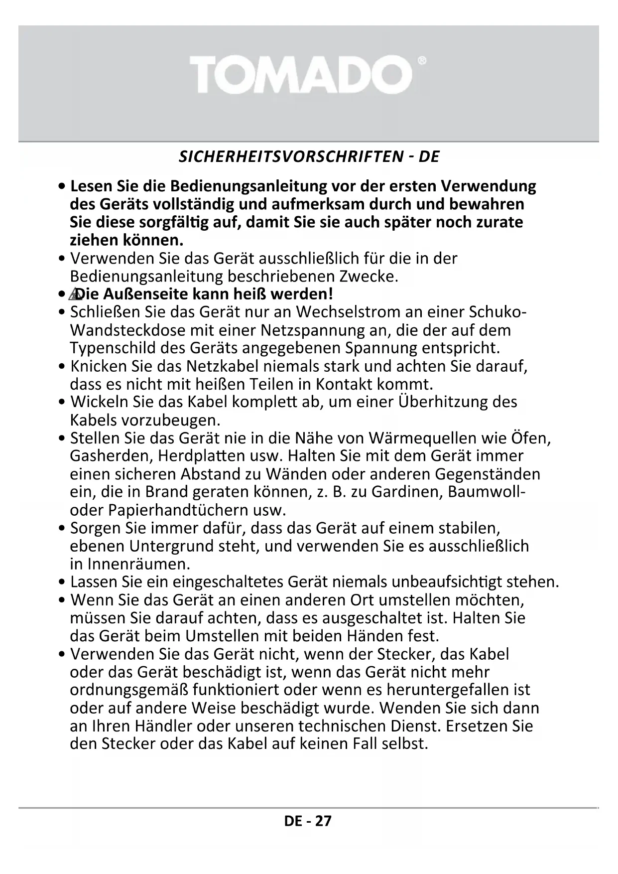 DE - 27• Reparaturen an elektrischen Geräten dürfen nur von Fachleuten durchgeführt werden. Falsch ausgeführte Reparaturen können zu erheblichen Gefahren für den Benutzer führen.