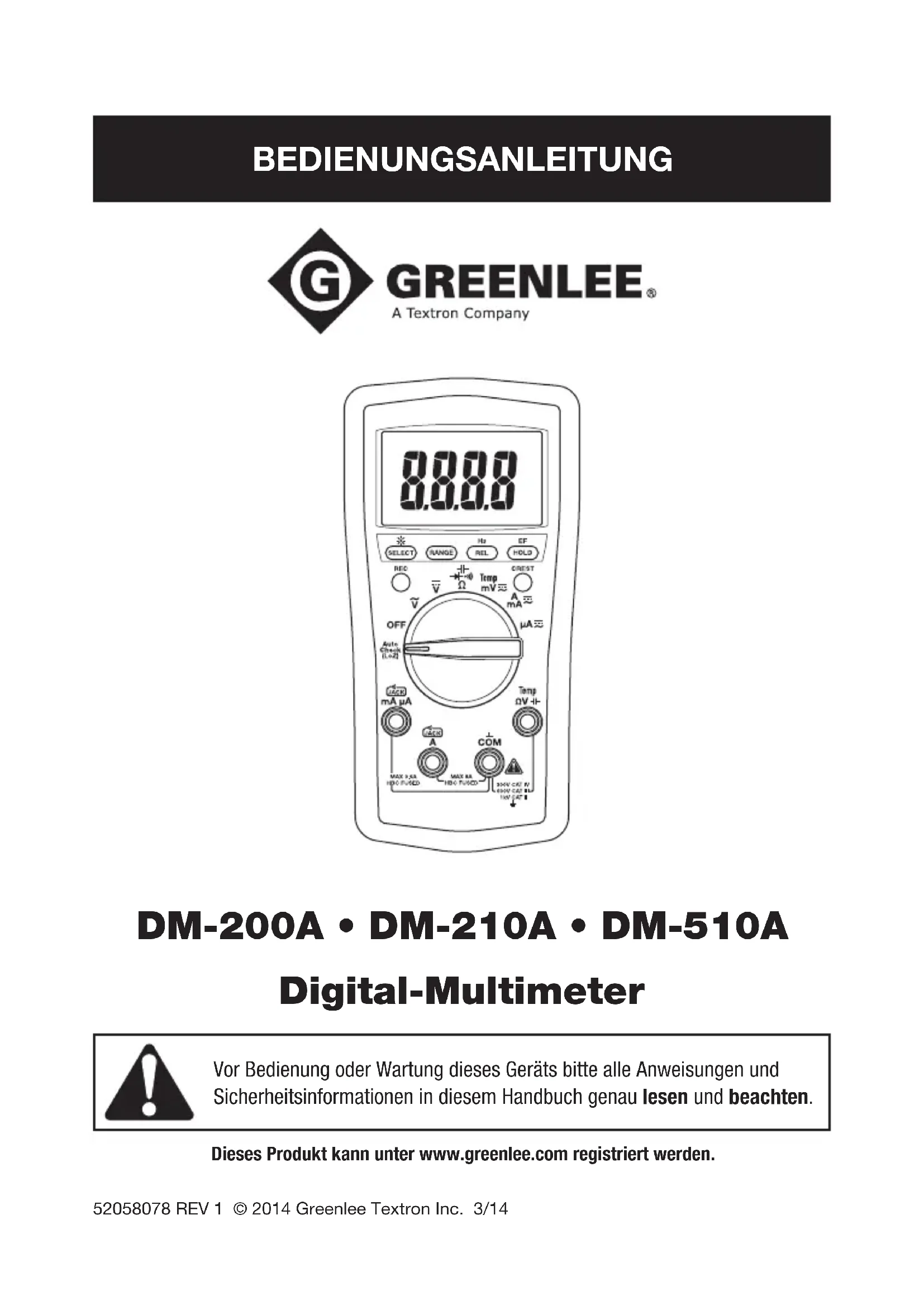 in gomma. Pulitura Pulire periodicamente la custodia con un panno umido e detergente neutro; non usare abrasivi o solventi.72 Garanzia limitata a vita Greenlee Textron Inc. garantisce all’acquirente originale di questi prodotti che l’uso degli stessi sarà libero da difetti di manodopera e materiale per la loro vita utile, ad eccezione di usura naturale ed abuso. Questa garanzia è soggetta alle stesse condizioni contenute nella garanzia limitata di un anno, standard della Greenlee Textron Inc. Per la riparazione di tutti gli strumenti di collaudo, rivolgersi al reparto Assistenza clienti al numero +1-815-397-7070 e richiedere un numero di autorizzazione per la restituzione. Per le parti non coperte dalla garanzia (quali componenti caduti o utilizzati in modo erroneo), è disponibile su richiesta un preventivo di riparazione con addebito. Nota: prima di restituire uno strumento di collaudo, controllare le pile o accertarsi che siano completamente cariche.BEDIENUNGSANLEITUNG Vor Bedienung oder Wartung dieses Geräts bitte alle Anweisungen und Sicherheitsinformationen in diesem Handbuch genau lesen und beachten. Dieses Produkt kann unter www.greenlee.com registriert werden. DM-200A • DM-210A • DM-510A Digital-Multimeter 52058078 REV 1 © 2014 Greenlee Textron Inc. 3/1474 Beschreibung Die Digital-Multimeter DM-200A, DM-210A und DM-510A von Greenlee sind Handmessgeräte mit den folgenden Messfähigkeiten: Wechsel- und Gleichspannung, Wechsel- und Gleichstrom, Frequenz und Widerstand. Sie können zudem zur Überprüfung von Dioden und zur Durchgangsprüfung eingesetzt werden. Eine optionale optisch isolierte Computerschnittstelle mit Software erleichtert die Aufzeichnung von erfassten Werten vom Messgerät auf einen Computer. Zu den weiteren Spezialfähigkeiten und -funktionen, die allen Messgeräten gemein sind, gehören u. a.:
