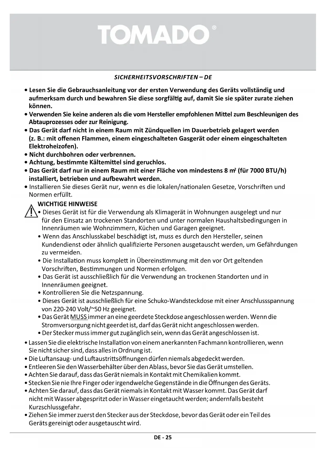 Das Ableiten von Kondensat ist auch auf die auf Seite 12 unter ENTFEUCHTENBESCHRIEBENEWEISEMÖGLICH. Ablassönung Ablassönung DE - 34 REINIGUNG UND WARTUNGSTÖRUNGEN UND LÖSUNGEN Kontrollieren Sie zuerst die folgenden Punkte, bevor Sie das Klimagerät zur Reparatur abgeben. Störung MöglicheUrsache Lösung Das Gerät geht nicht an, wenn die Ein/Aus- Taste gedrückt wird. Die Anzeigelampe für den Wassertank blinkt und der Wassertank ist voll. Entleeren Sie den Wassertank. Die Raumtemperatur ist niedriger als die eingestellte Temperatur. Stellen Sie die Temperatur neu ein. Das Gerät kühlt nicht genug. Nicht alle Türen und Fenster sind geschlossen. Sorgen Sie dafür, dass alle Türen und Fenster geschlossen sind. Im Raum sind Wärmequellen akv. Enernen Sie die Wärmequellen oder schalten Sie diese aus, wenn das möglich ist. Die Temperatur ist zu hoch eingestellt. Stellen Sie die Temperatur neu ein. Die Luansaugönung ist blockiert. Reinigen Sie das Lueinlassgier. Das Gerät macht Lärm. Die Oberäche, auf der das Gerät steht, ist nicht waagerecht oder eben genug. Stellen Sie das Gerät auf einen ebenen Untergrund und richten Sie es (wenn möglich) waagerecht aus. Der Lärm wird durch die strömende Kühlüssigkeit im Inneren des Klimageräts erzeugt. Das ist normal. Das Gerät reagiert nicht auf die Fernbedienung Das Gerät wurde über das Bedienpult auf dem Gerät selbst eingeschaltet. Die Fernbedienung wurde nicht akviert. Drücken Sie auf der Fernbedienung den Ein/Aus-Knopf, um die Fernbedienung zu akvieren. Das Gerät schaltet sich in den ersten 3 Minuten nicht ein, nachdem es erneut angeschaltet wurde. Der interne Schutzschalter des Kompressors verhindert, dass das Gerät innerhalb von 3 Minuten nach dem Ausschalten wieder eingeschaltet wird. Diese Verzögerung ist normal; das Gerät funkoniert wieder ordnungsgemäß, wenn die 3 Minuten vorbei sind. Fehlercode P1 Der Wassertank ist voll. Entleeren Sie den Wassertank. Fehlercode E0 EEPROM Technischer Defekt. Nehmen Sie Kontakt mit dem Kundendienst von Tomado auf. Fehlercode E1 Sensor für Raumtemperatur defekt. Nehmen Sie Kontakt mit dem Kundendienst von Tomado auf. Fehlercode E2 Verdampfersensor defekt. Nehmen Sie Kontakt mit dem Kundendienst von Tomado auf. Fehlercode E3 Kondensatorsensor defekt. Nehmen Sie Kontakt mit dem Kundendienst von Tomado auf. Fehlercode E4 Bedienfeld defekt.6 Nehmen Sie Kontakt mit dem Kundendienst von Tomado auf. DE - 35 TECHNISCHE DATEN Typennummer TMA7000B Spannung 220-240 Volt ~50 Hz Anschlusswert 980 Wa Kühlleistung* 7000 BTU/h (2,0 kW) EE-Klasse* A EER* 2,6 Leistungsaufnahme kW 0,8 Leistungsaufnahme Stand-by W 0,5 Stromverbrauch nom. A 3,45 Luverdrängung max. m3/h 272 Eneuchtung max. ** l/h 1,94 Geeignet für Anz. m3 60 Kältemiel / GWP-Typ / g R-290 / 3 / 140 g Bereich des Thermostats °C 17 - 30 Lüergeschwindigkeiten 2 Max. Lärmpegel dB(A) 62 dB(A) Abmessungen (HxBxT) 634 x 329 x 318 mm Neogewicht 21,5 kg Schutzklasse IPX0 Fernbedienung ja Dieses Symbol weist darauf hin, dass dieses Produkt nicht mit dem normalen Hausmüll entsorgt werden darf (2012/19/EU). Befolgen Sie die in Ihrem Land geltenden Vorschrien in Bezug auf die getrennte Sammlung von Elektro- und Elektronikgeräten. Durch eine korrekte Entsorgung des Produkts beugen Sie negaven Folgen für die Umwelt und die Volksgesundheit vor. Das Verpackungsmaterial ist zu 100% recycelbar; sammeln Sie das Verpackungsmaterial daher getrennt ein. RECYCLING•Lisezaenvementetenèrementlemoded’emploiavantd’uliserl’appareilpourla premièrefois,etconservez-lesoigneusementpouruneconsultaonfuture.