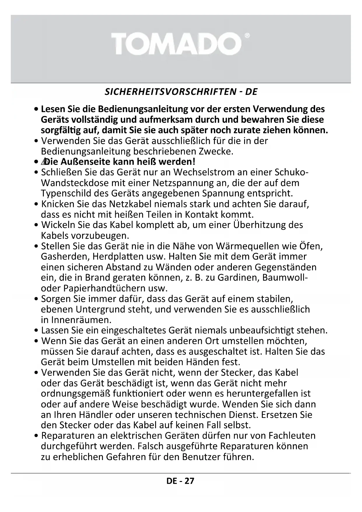 Für dieses Produkt gewähren wir eine Garane von 24 Monaten. Diese Garane gilt jedoch nur, wenn das Produkt in Übereinsmmung mit den Anweisungen in der Gebrauchsanleitung und für den Zweck, für den es hergestellt wurde, verwendet wird. Darüber hinaus muss der originale Kaueleg (mit Kaufdatum, Namen des Einzelhändlers und Arkelnummer des Produkts) vorgelegt werden. Die ausführlichen Garanebesmmungen nden Sie auf unserer Webseite: www.tomado.com/support GARANTIEBESTIMMUNGEN Rendez-vous sur www.tomado.com/support pour acheter des accessoires ou des pièces de rechange.