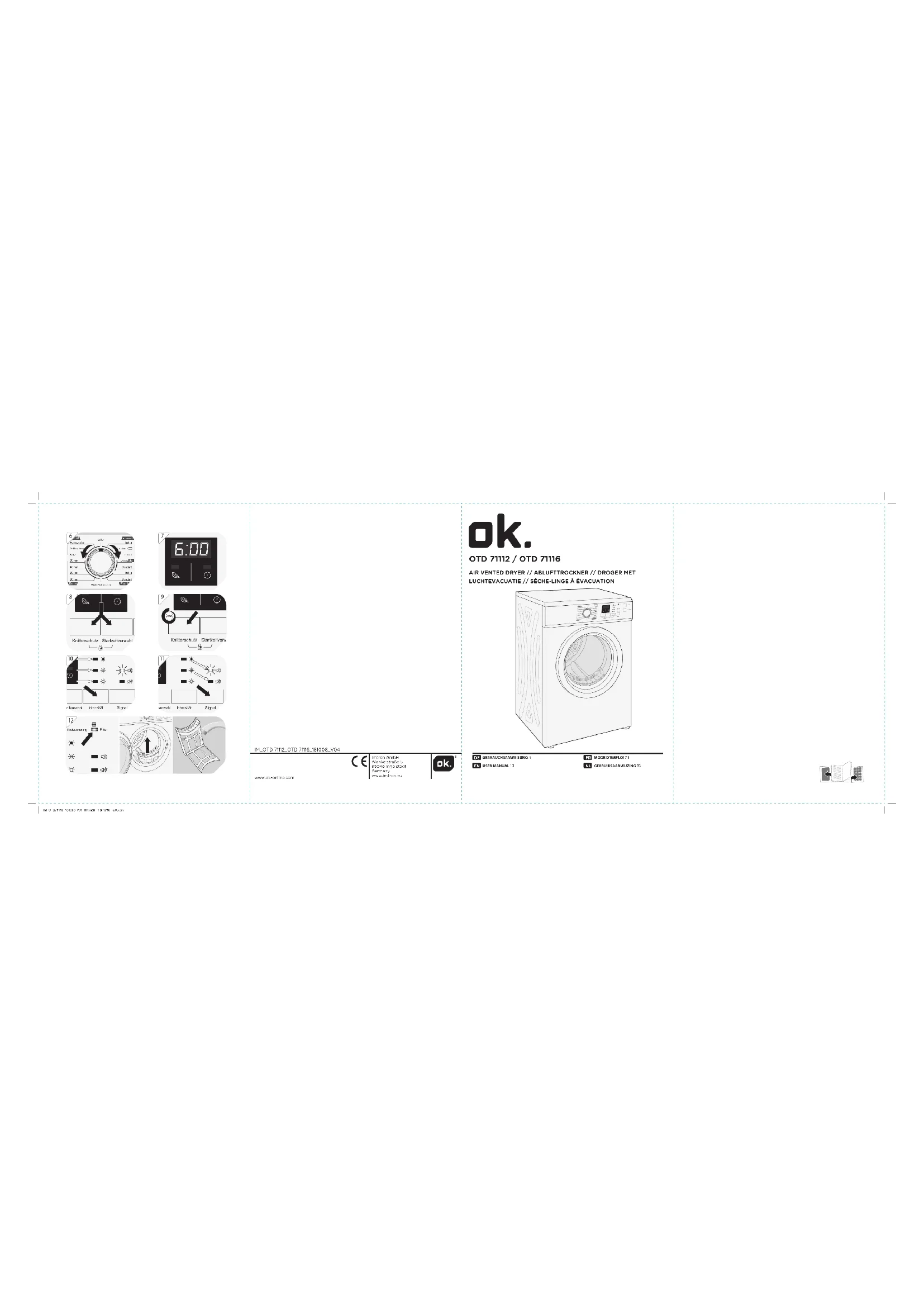 SpezialBaumwolle Mix PflegeleichtDauerWolleAuffrischen Kurz 30 min40 min50 min60 minStandardExtraExtraStandardLeichtStandardFeinwäscheExtraLüftenStartzeitvorwahlKnitterschutzIntentsitätSignalKindersicherungFilterEin/AusStart/PauseSpezialBaumwolle Mix PflegeleichtDauerWolle AuffrischenAuffrischen Kurz 30 min40 min50 min60 minStandardExtraExtraStandardLeichtStandardFeinwäscheExtraLüftenStartzeitvorwahlKnitterschutzIntensitätSignalKindersicherungFilterEin/AusStart/Pause 8:88 a1 a2 a3 a4 a5a6a7a8a9 OTD 71112 SpeciaalKatoen Mix SyntheticsTijdWol refreshRefresh Snel 30 min40 min50 min60 minKastdroogKastdroog+ Kast droog+KastdroogStrijkdroogKastdroogDelicaatKastdroog+VentilatieUitstelAnti-KreukIntensiteit SignaalKinderver-grendelingFilterAan/UitStart/Pause 8:88 a1 a2 a3 a4 a5a6a7a8a9 OTD 71116 IM_OTD71116_181008_V04_HR.indb 2 8/10/18 5:05 pm3 HERZLICHEN GLüCKWUNSCH! Vielen Dank, dass Sie sich für ein Produkt von ok. entschieden haben. Bitte lesen Sie diese Anleitung sorgfältig durch und bewahren Sie sie für späteren Gebrauch auf. WICHTIGE SICHERHEITSANWEISUNGEN. BITTE AUFMERKSAM DURCHLESEN UND FüR SPÄTEREN GEBRAUCH AUFBEWAHREN.