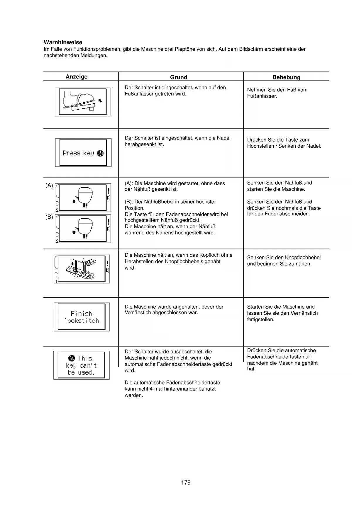 Abaisser la griffe d'entraînement. Appuyer sur la touche “Coupe-fil automatique”. Abaisser le pied presseur. Appuyer sur la touche ”Coupe-fil automatique”. Placer le fil dans le levier releveur de fil ou démêler le fil dans la zone de la canette et du mécanisme de coupe-fil automatique. Patienter 15 secondes avant de redémarrer. Ne pas déplacer la griffe d’entraînement pendant la couture. Mettre l’interrupteur d’alimentation en position d’arrêt. Démêler le fil. Prendre contact avec le revendeur ou le centre technique agréé Elga chez lequel vous avez acheté votre machine. Mettez l’interrupteur d’alimentation en position d’arrêt. Attendre 5 secondes et remettre la machine sous tension.179 Grund Der Schalter ist eingeschaltet, wenn auf den Fußanlasser getreten wird. Der Schalter ist eingeschaltet, wenn die Nadel herabgesenkt ist. (A): Die Maschine wird gestartet, ohne dass der Nähfuß gesenkt ist. (B): Der Nähfußhebel in seiner höchste Position. Die Taste für den Fadenabschneider wird bei hochgestelltem Nähfuß gedrückt. Die Maschine hält an, wenn der Nähfuß während des Nähens hochgestellt wird. Die Maschine hält an, wenn das Kopfloch ohne Herabstellen des Knopflochhebels genäht wird. Die Maschine wurde angehalten, bevor der Vernähstich abgeschlossen war. Der Schalter wurde ausgeschaltet, die Maschine näht jedoch nicht, wenn die automatische Fadenabschneidertaste gedrückt wird. Die automatische Fadenabschneidertaste kann nicht 4-mal hintereinander benutzt werden. Warnhinweise Im Falle von Funktionsproblemen, gibt die Maschine drei Pieptöne von sich. Auf dem Bildschirm erscheint eine der nachstehenden Meldungen. Behebung Nehmen Sie den Fuß vom Fußanlasser. Drücken Sie die Taste zum Hochstellen / Senken der Nadel. Senken Sie den Nähfuß und starten Sie die Maschine. Senken Sie den Nähfuß und drücken Sie nochmals die Taste für den Fadenabschneider. Senken Sie den Knopflochhebel und beginnen Sie zu nähen. Starten Sie die Maschine und lassen Sie sie den Vernähstich fertigstellen. Drücken Sie die automatische Fadenabschneidertaste nur, nachdem die Maschine genäht hat. Anzeige (A) (B)180 Grund Die Maschine näht nicht mit der Start-/Stopptaste, denn der Fußanlasser ist anschlossen. Die Zwillingsnadeltaste wurde nach Auswahl eines Stiches gedrückt, der nicht mit einer eingelegten Zwillingsnadel kompatibel ist. Die Dehnungstaste wurde gedrückt, nachdem ein Stich ausgewählt wurde, der nicht gedehnt werden kann. Die Dehnungstaste wurde gedrückt, nachdem ein Stich ausgewählt wurde, der nicht gedehnt werden kann. Das automatische Fadenabschneiden wurde durch Ausschalten der Maschine unterbrochen. Der Netzschalter wird wieder eingeschaltet und das automatische Fadenabschneiden muss beendet werden. Der Nähfuß wurde hochgestellt und das automatische Fadenabschneiden war nicht beendet. Die Maschine hält an, weil sich kein Faden im Fadenhebel befindet oder weil er im Spulenbereich verheddert ist. Der Transport wurde während des Nähens abgesenkt. Die Spulerspindel bleibt während des Spulens stecken. Betriebsstörung der Maschine aufgrund des angezeigten Problems. Beispiel: "E1-Fehler" - Fehler bei der Voreinstellung des Schrittmotors. Die Flüssigkristallanzeige ist abnormal. Anzeige Behebung Nehmen Sie den Fußanlasser ab. Wählen Sie einen anderen Stich oder nähen Sie mit einer Einzelnadel. Die Dehnung kann nur mit Federstichen 081 - 090 verwendet werden. Senken Sie den Transporteur. Drücken Sie die automatische Fadenabschneidertaste. Senken Sie den Nähfuß ab. Drücken Sie die automatische Fadenabschneidertaste. Fädeln Sie Faden in den Fadenhebel ein oder entfernen Sie den verhedderten Faden vom Spulenbereich und automatischen Fadenabschneider. Warten Sie 15 Sekunden lang, bevor Sie erneut starten. Bewegen Sie den Tr ansporteurhebel während des Nähens nicht. Schalten Sie den Netzschalter aus. Entfernen Sie die verhedderten Fäden. Kontaktieren Sie den Händler oder das Kundendienstzentrum, bei denen Sie Ihre Maschine gekauft haben. Schalten Sie den Netzschalter aus. Warten Sie 5 Sekunden lang und schalten Sie den Netzschalter wieder ein.181 Cause
