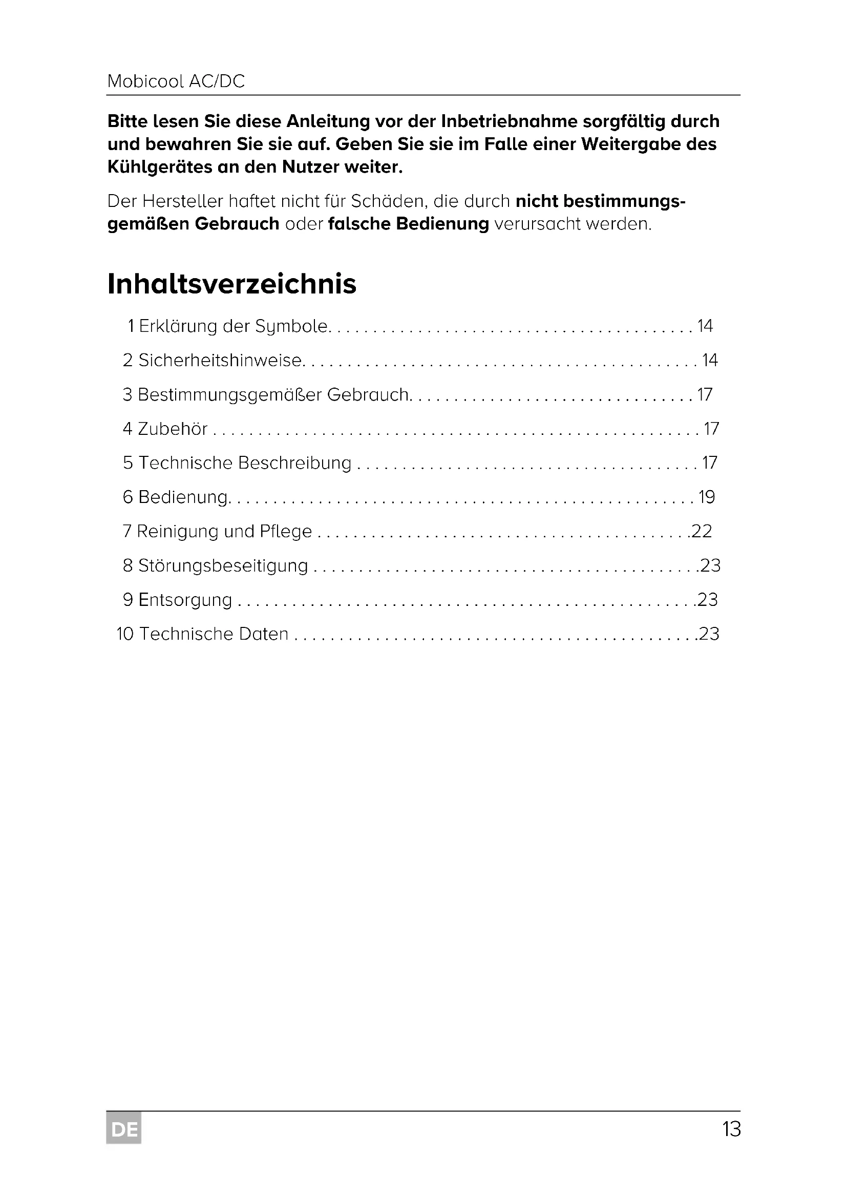 - Bitte lesen Sie diese Anleitung vor der Inbetriebnahme sorgfältig durch und bewahren Sie sie auf. Geben Sie sie im Falle einer Weitergabe des Kühlgerätes an den Nutzer weiter. Der Hersteller haftet nicht für Schäden, die durch nicht bestimmungs- gemäßen Gebrauch oder falsche Bedienung verursacht werden. Inhaltsverzeichnis 1 Erklärung der Symbole p. 14