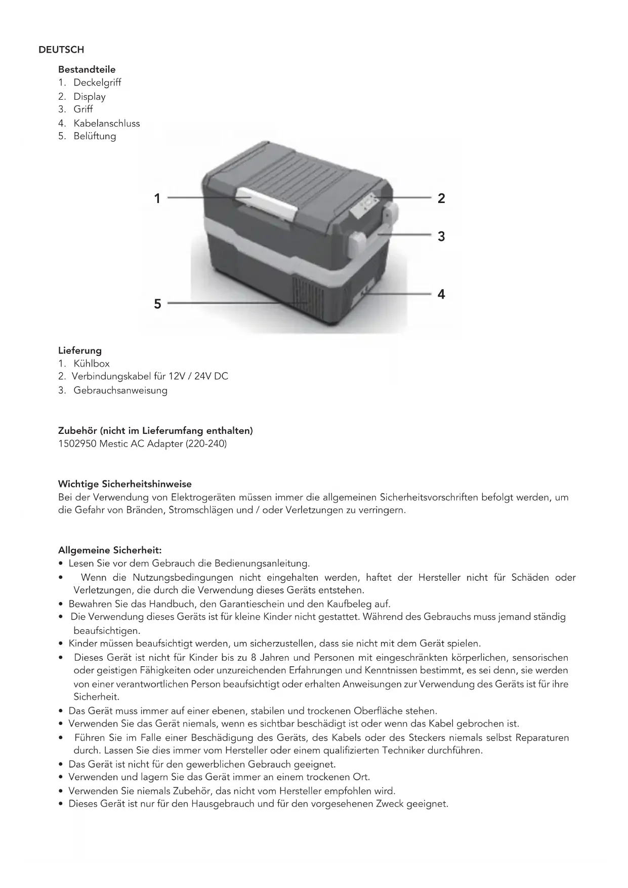 Zubehör (nicht im Lieferumfang enthalten) 1502950 Mestic AC Adapter (220-240) Wichtige Sicherheitshinweise Bei der Verwendung von Elektrogeräten müssen immer die allgemeinen Sicherheitsvorschriften befolgt werden, um die Gefahr von Bränden, Stromschlägen und / oder Verletzungen zu verringern. Allgemeine Sicherheit: