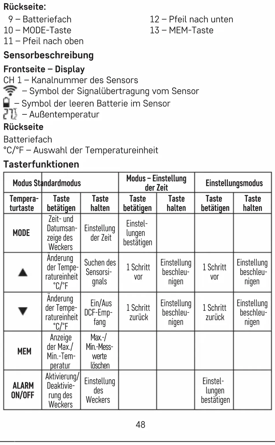 Ab-Pfeiltasten gedrückt. Auswahl der Temperatureinheit °C/°F Durch das wiederholte Drücken der / -Taste stellen Sie die Anzeige der Temperatureinheit °C oder °F ein. Display-Anzeigemodus Durch wiederholte Betätigung der MODE-Taste wird schrittweise Folgendes angezeigt: Aktuelle Uhrzeit – Weckzeit – Datum. Einstellung des Weckers Durch lange Betätigung der ALARM ON/OFF-Taste zusammen mit den / -Tasten wird die Weckzeit gewählt. Zwischen den Messwerten bewegen Sie mit einem Tastendruck auf die ALARM ON/OFF-Taste. Nach der Einstellung der Stunden und der Minuten betätigen Sie erneut die ALARM ON/OFF-Taste. Das Glocken-Symbol bedeutet, dass der Wecker aktiv ist.52 Zur Deaktivierung des Weckers betätigen Sie die ALARM-Taste erneut, das Glocken-Symbol erlischt. Die wiederholt Wecken-Funktion (SNOOZE) und die Display- beleuchtung Mit einem Tastendruck auf die SNOOZE /LIGHT-Taste beim Klingeln verschieben Sie das Klingeln des Weckers um 5 Minuten. Im Display wird das Symbol „Zz“angezeigt. Zum Beenden der SNOOZE-Funktion betätigen Sie eine beliebige Taste außer der SNOOZE-Taste. Falls Sie die SNOOZE-Funktion nicht nutzen wolen, betätigen Sie beim Wecken eine beliebige Taste außer der SNOOZE-Taste, der Wecker aktiviert sich am nächsten Tag. Wird während des Klingelns keine Taste betätigt, wird der Alarm 2 Minuten aktiv sein und aktiviert sich am nächsten Tag. Im Standard-Modus wird durch das Drücken der SNOOZE/LIGHT-Taste die Displaybeleuchtung für 10 Sekunden aktiviert. Messwertspeicher Durch eine wiederholte Betätigung der MEM-Taste werden die ma- ximalen und minimalen Messwerte der Außen-und Innentemperatur angezeigt. Um den Speicher zu löschen, drücken Sie lange die MEM-Taste im Anzeigemodus der maximalen/minimalen Werte. Pege und Instandhaltung Das Produkt ist so entworfen, dass es bei sachgemäßem Umgang viele Jahre zuverlässig hält. Hier sind einige Ratschläge für die richtige Bedienung:
