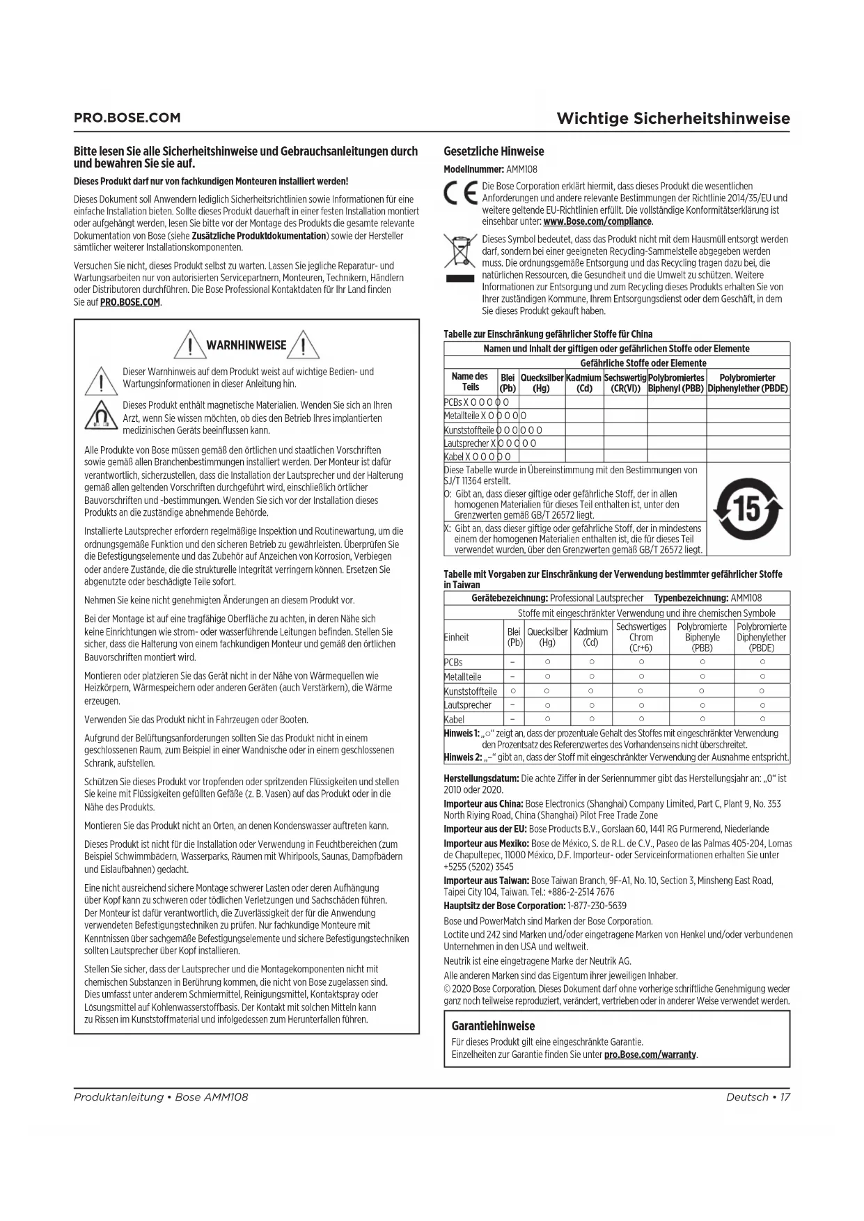 Einzelheiten zur Garantie finden Sie unter pro.Bose.com/warranty