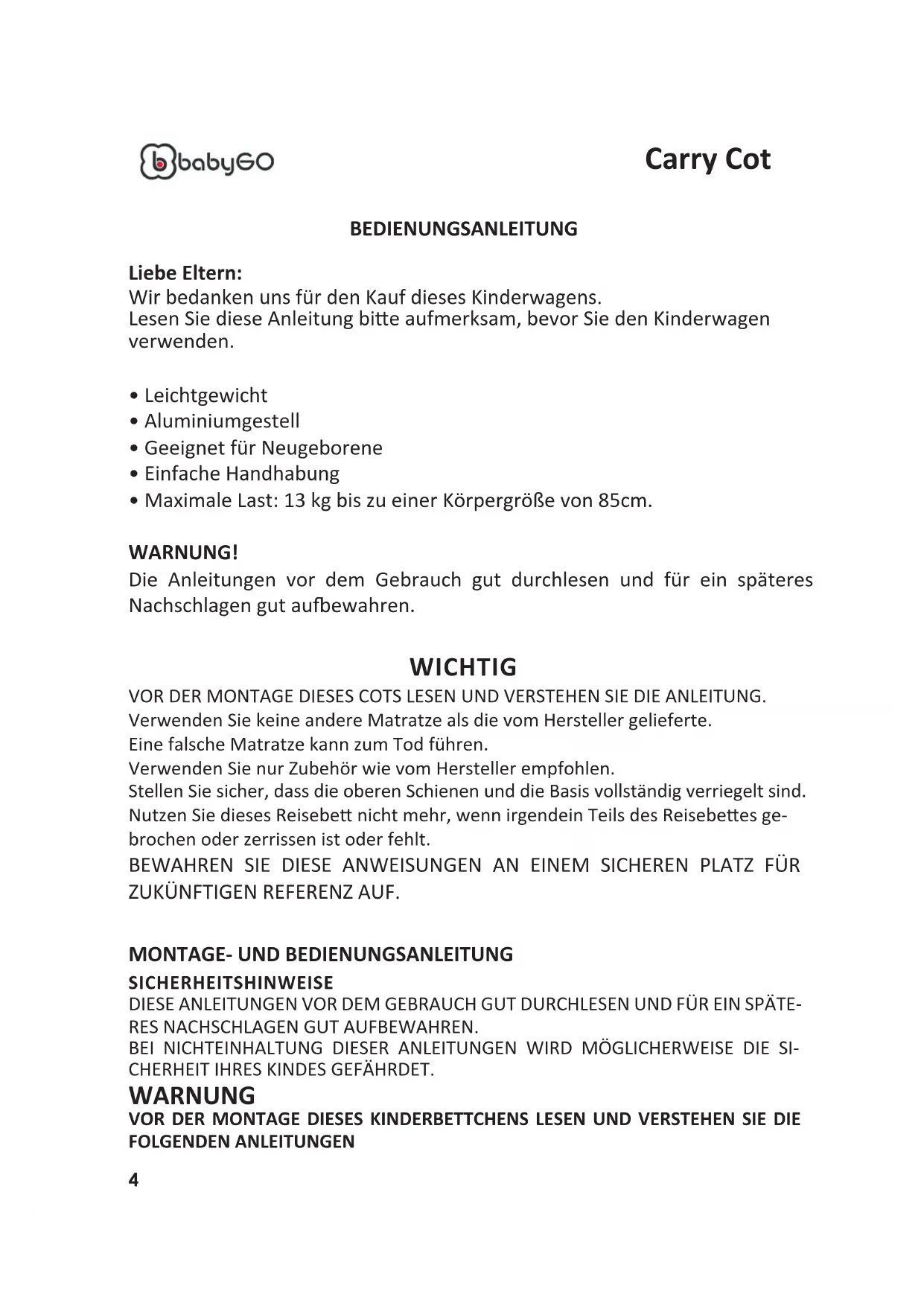 SICHERHEITSHINWEISE DIESE ANLEITUNGEN VOR DEM GEBRAUCH GUT DURCHLESEN UND FÜR EIN SPÄTE- RES NACHSCHLAGEN GUT AUFBEWAHREN. BEI NICHTEINHALTUNG DIESER ANLEITUNGEN WIRD MÖGLICHERWEISE DIE SI- CHERHEIT IHRES KINDES GEFÄHRDET. WARNUNG VOR DER MONTAGE DIESES KINDERBETTCHENS LESEN UND VERSTEHEN SIE DIE FOLGENDEN ANLEITUNGEN WICHTIG VOR DER MONTAGE DIESES COTS LESEN UND VERSTEHEN SIE DIE ANLEITUNG. Verwenden Sie keine andere Matratze als die vom Hersteller gelieferte. Eine falsche Matratze kann zum Tod führen. Verwenden Sie nur Zubehör wie vom Hersteller empfohlen. Stellen Sie sicher, dass die oberen Schienen und die Basis vollständig verriegelt sind. Nutzen Sie dieses Reisebe nicht mehr, wenn irgendein Teils des Reisebees ge- brochen oder zerrissen ist oder fehlt. BEWAHREN SIE DIESE ANWEISUNGEN AN EINEM SICHEREN PLATZ FÜR ZUKÜNFTIGEN REFERENZ AUF.