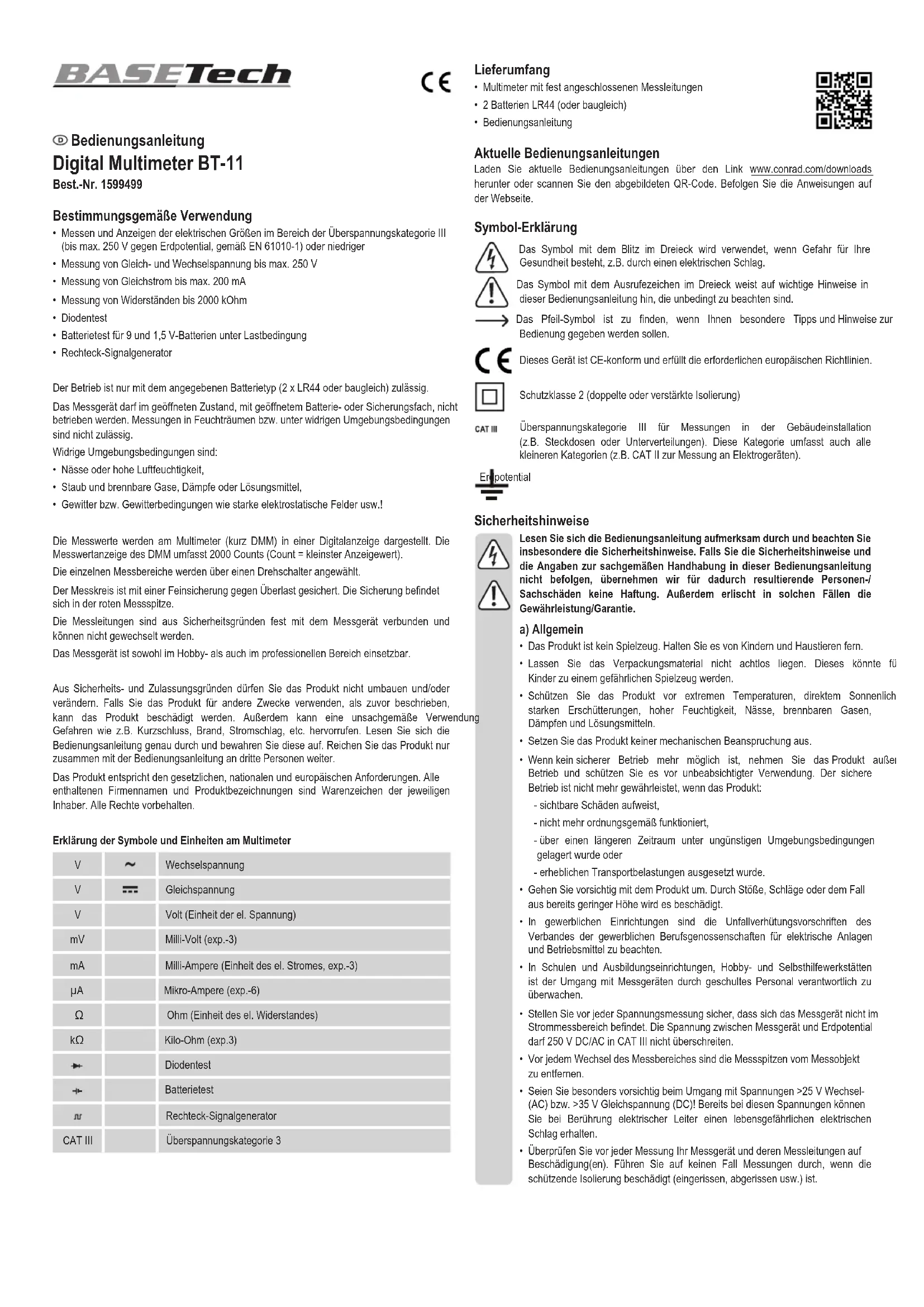 - Bedienungsanleitung Aktuelle Bedienungsanleitungen Laden Sie aktuelle Bedienungsanleitungen über den Link www.conrad.com/downloads herunter oder scannen Sie den abgebildeten QR-Code. Befolgen Sie die Anweisungen auf der Webseite. Symbol-Erklärung Das Symbol mit dem Blitz im Dreieck wird verwendet, wenn Gefahr für Ihre Gesundheit besteht, z.B. durch einen elektrischen Schlag. Das Symbol mit dem Ausrufezeichen im Dreieck weist auf wichtige Hinweise in dieser Bedienungsanleitung hin, die unbedingt zu beachten sind. Das Pfeil-Symbol ist zu nden, wenn Ihnen besondere TippsundHinweisezur Bedienung gegeben werden sollen. DiesesGerätistCE-konformunderfülltdieerforderlicheneuropäischenRichtlinien. Schutzklasse2(doppelteoderverstärkteIsolierung) Überspannungskategorie III für Messungen in der Gebäudeinstallation (z.B. Steckdosen oder Unterverteilungen). Diese Kategorie umfasst auch alle kleinerenKategorien(z.B.CATIIzurMessunganElektrogeräten). Erdpotential Sicherheitshinweise Lesen Sie sich die Bedienungsanleitung aufmerksam durch und beachten Sie insbesondere die Sicherheitshinweise. Falls Sie die Sicherheitshinweise und die Angaben zur sachgemäßen Handhabung in dieser Bedienungsanleitung nicht befolgen, übernehmen wir für dadurch resultierende Personen-/ Sachschäden keine Haftung. Außerdem erlischt in solchen Fällen die Gewährleistung/Garantie. a) Allgemein