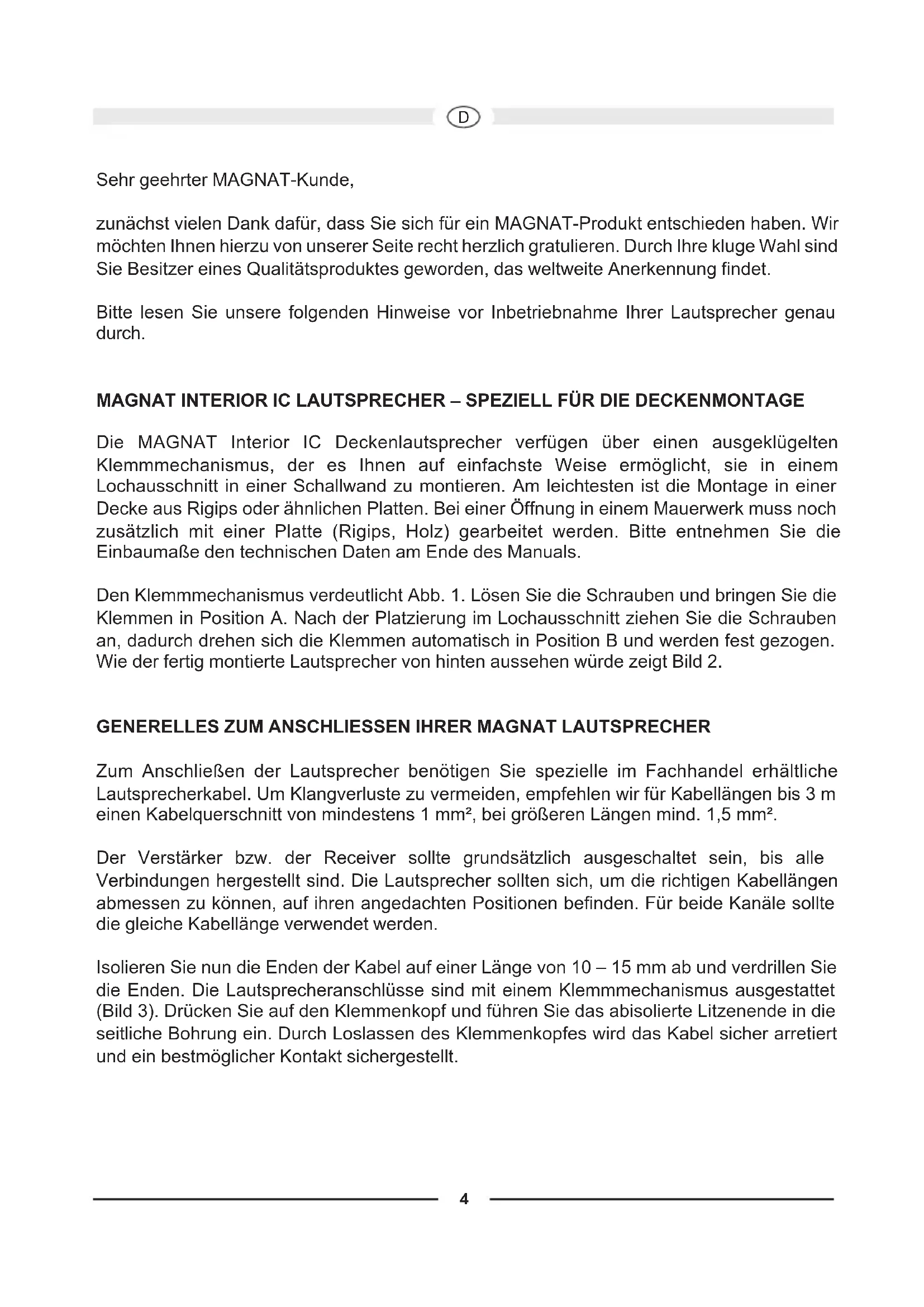 Sehr geehrter MAGNAT-Kunde, zunächst vielen Dank dafür, dass Sie sich für ein MAGNAT-Produkt entschieden haben. Wir möchten Ihnen hierzu von unserer Seite recht herzlich gratulieren. Durch Ihre kluge Wahl sind Sie Besitzer eines Qualitätsproduktes geworden, das weltweite Anerkennung findet. Bitte lesen Sie unsere folgenden Hinweise vor Inbetriebnahme Ihrer Lautsprecher genau durch. MAGNAT INTERIOR IC LAUTSPRECHER – SPEZIELL FÜR DIE DECKENMONTAGE Die MAGNAT Interior IC Deckenlautsprecher verfügen über einen ausgeklügelten Klemmmechanismus, der es Ihnen auf einfachste Weise ermöglicht, sie in einem Lochausschnitt in einer Schallwand zu montieren. Am leichtesten ist die Montage in einer Decke aus Rigips oder ähnlichen Platten. Bei einer Öffnung in einem Mauerwerk muss noch zusätzlich mit einer Platte (Rigips, Holz) gearbeitet werden. Bitte entnehmen Sie die Einbaumaße den technischen Daten am Ende des Manuals. Den Klemmmechanismus verdeutlicht Abb. 1. Lösen Sie die Schrauben und bringen Sie die Klemmen in Position A. Nach der Platzierung im Lochausschnitt ziehen Sie die Schrauben an, dadurch drehen sich die Klemmen automatisch in Position B und werden fest gezogen. Wie der fertig montierte Lautsprecher von hinten aussehen würde zeigt Bild 2.