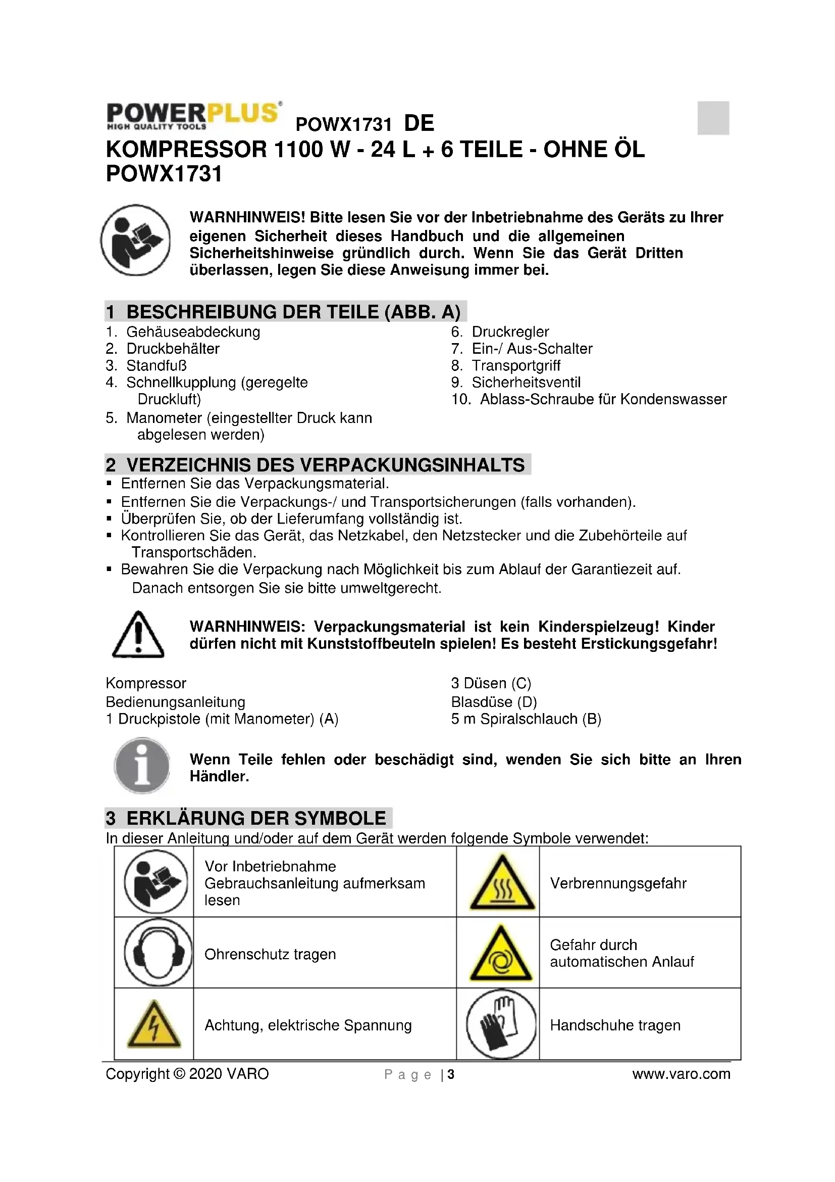 Copyright © 2020 VARO P a g e | 3 www.varo.com KOMPRESSOR 1100 W - 24 L + 6 TEILE - OHNE ÖL POWX1731 WARNHINWEIS! Bitte lesen Sie vor der Inbetriebnahme des Geräts zu Ihrer eigenen Sicherheit dieses Handbuch und die allgemeinen Sicherheitshinweise gründlich durch. Wenn Sie das Gerät Dritten überlassen, legen Sie diese Anweisung immer bei. 1 BESCHREIBUNG DER TEILE (ABB. A)
